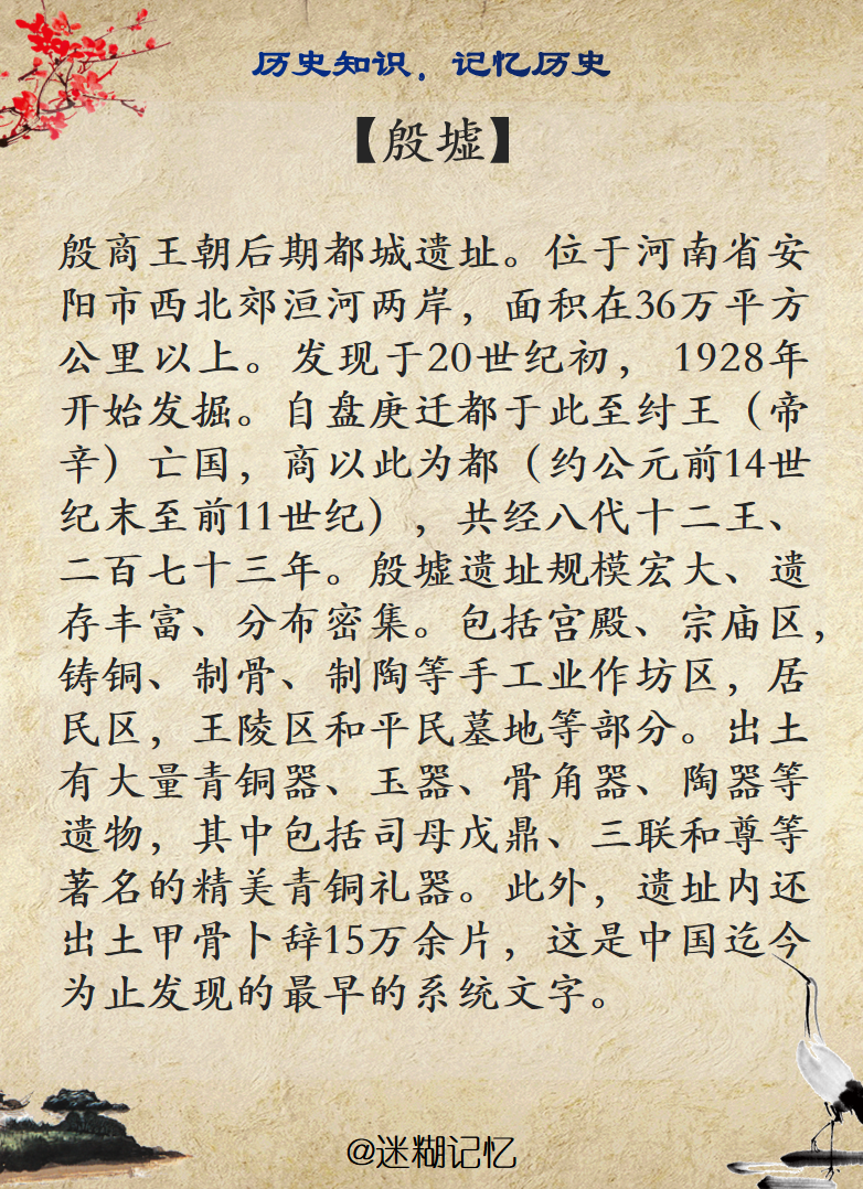 发现于20世纪初, 1928年开始发掘。自盘庚迁都于此至纣王(帝辛)亡国,商以此为都(约公元前14世纪末至前11世纪),共经八代十二王、二百七十三年。