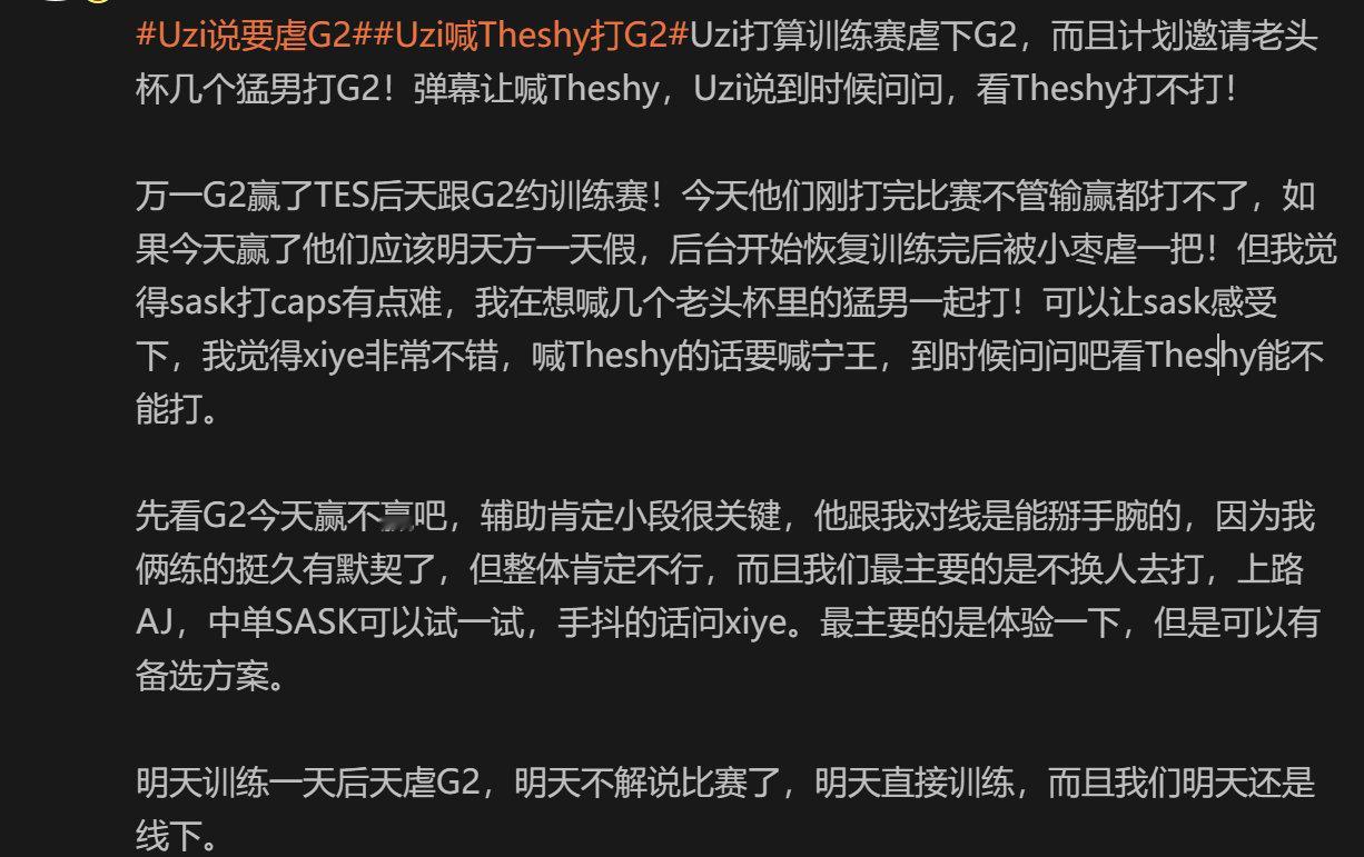可以看Uzi说的要虐G2而且计划喊Theshy: