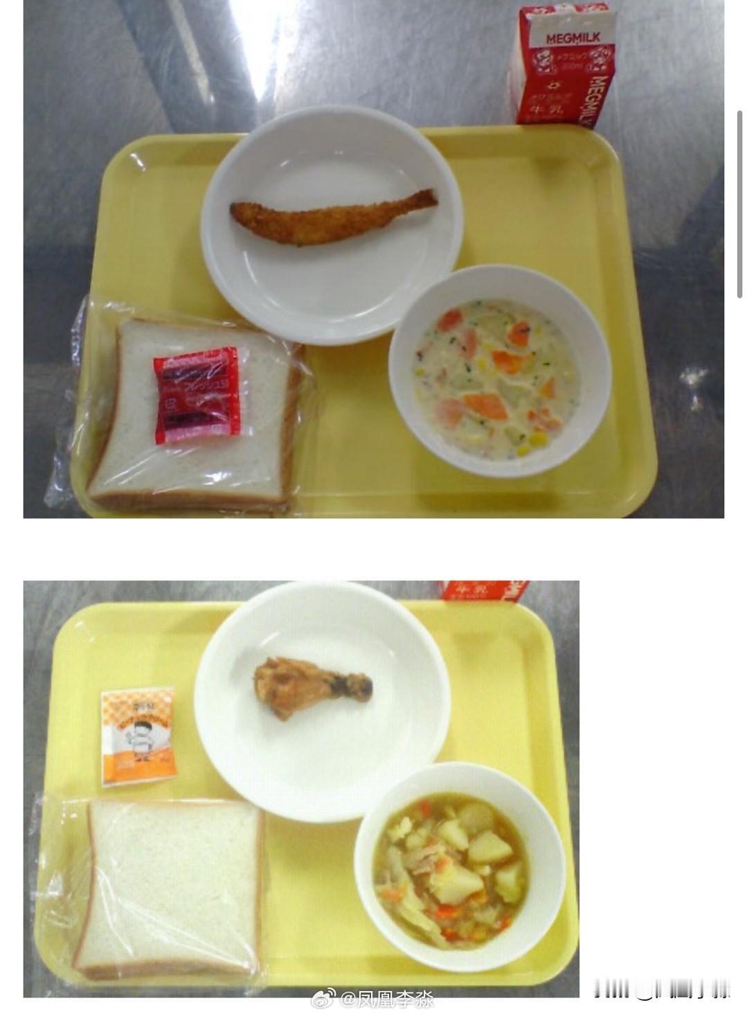 日本的学校午餐:图一,日本政府宣传的学校午餐照片,“令和时代的学校午餐,有各地土特产、丰富的国际特色”,推进“饮食教育”。但没想到此推下面,很多人上传了实际版的学校午餐,有的量少的可怜,“孩子说根本不够吃”。日本学校午餐向家长收取很较少费用,大部分由学校负担,部分城市还“完全免费”;但近期物价上涨,为节约成本,一些地方午餐内容也“简化”,很多学生说“吃不饱”。图二、三、四、五,是网友上传的学校午餐。