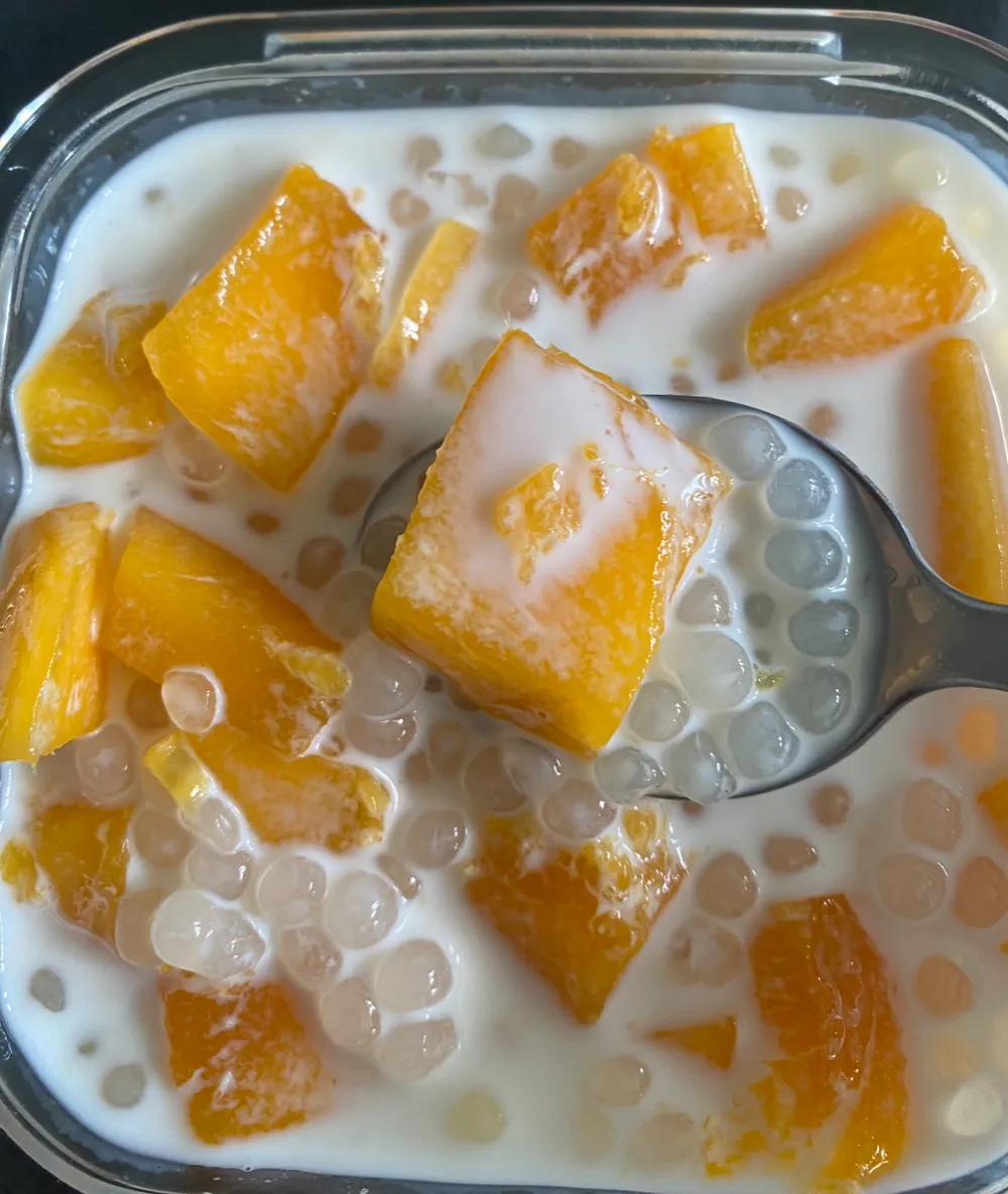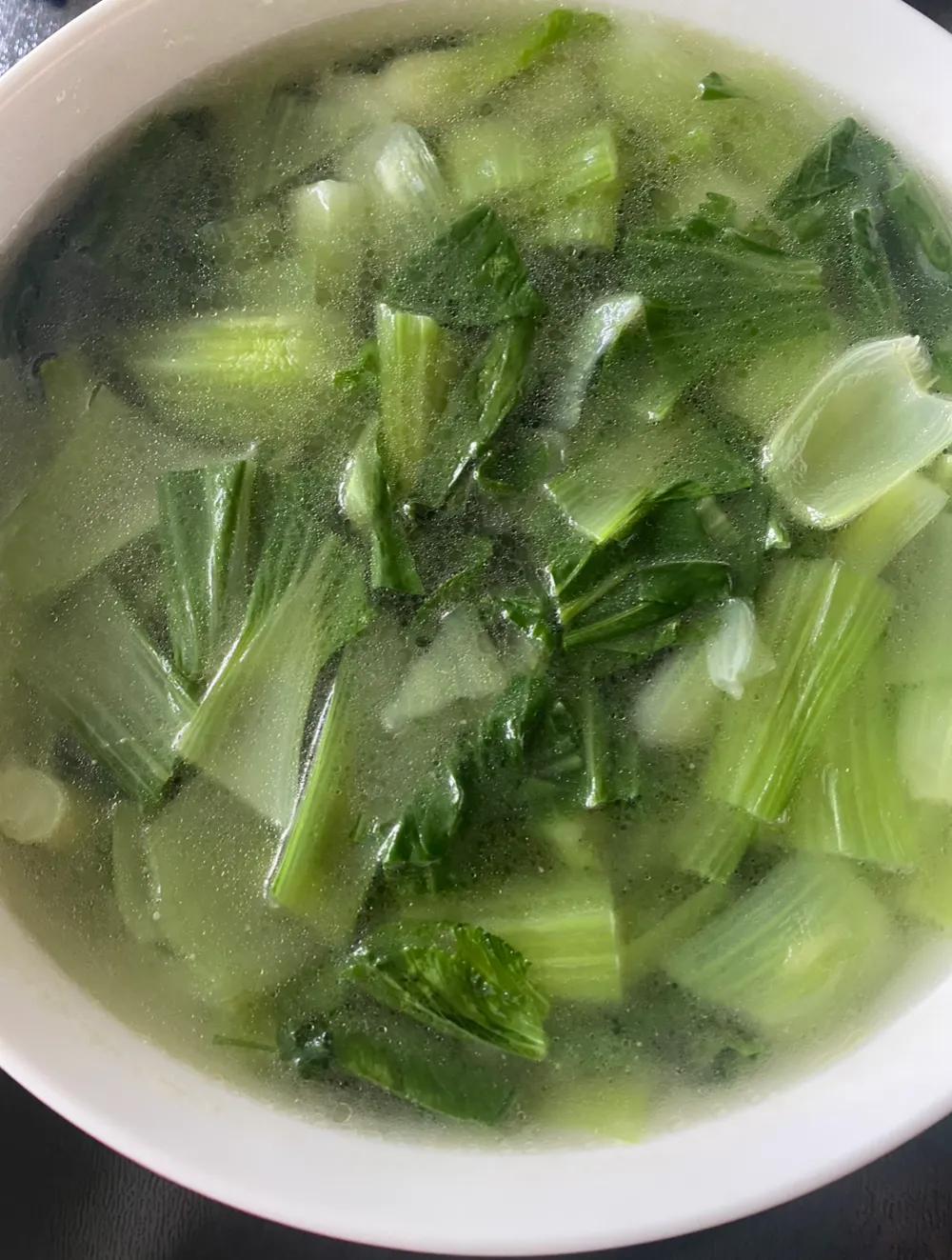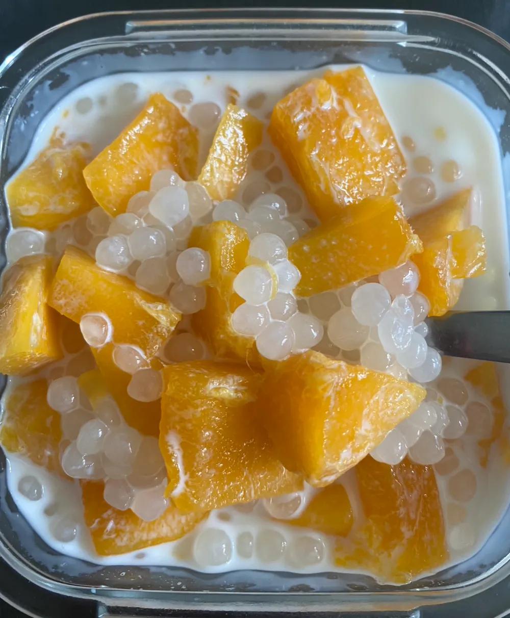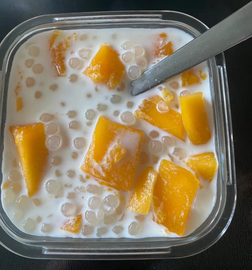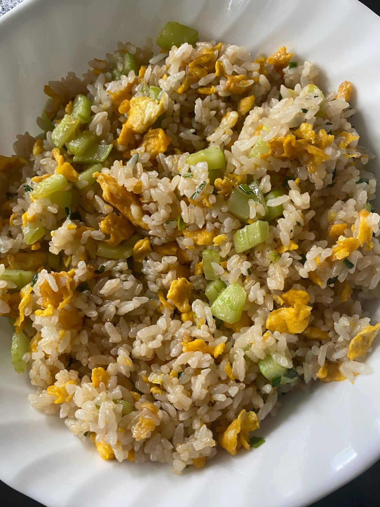 周末午餐简单点:鸡蛋炒饭,青菜汤,芒果西米露。 头天多的饭,放冰箱冷藏,拿出来加鸡蛋和黄瓜粒翻炒,加生抽调味,搭配青菜汤 ,主打一个简单,快手又清淡。 芒果西米露是夏天时,大人孩子都爱吃的一种甜品。