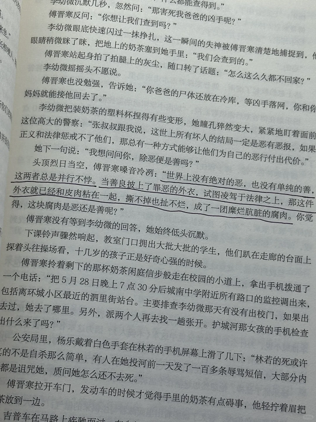 “世界上没有绝对的恶,也没有单纯的善,这两者总是并行不悖。当善良披上了罪e的外衣,试图凌驾于法律之上,那这件外衣就已经和皮肉粘在一起,撕不掉也扯不烂,成了一团糜烂肮脏的腐肉。”