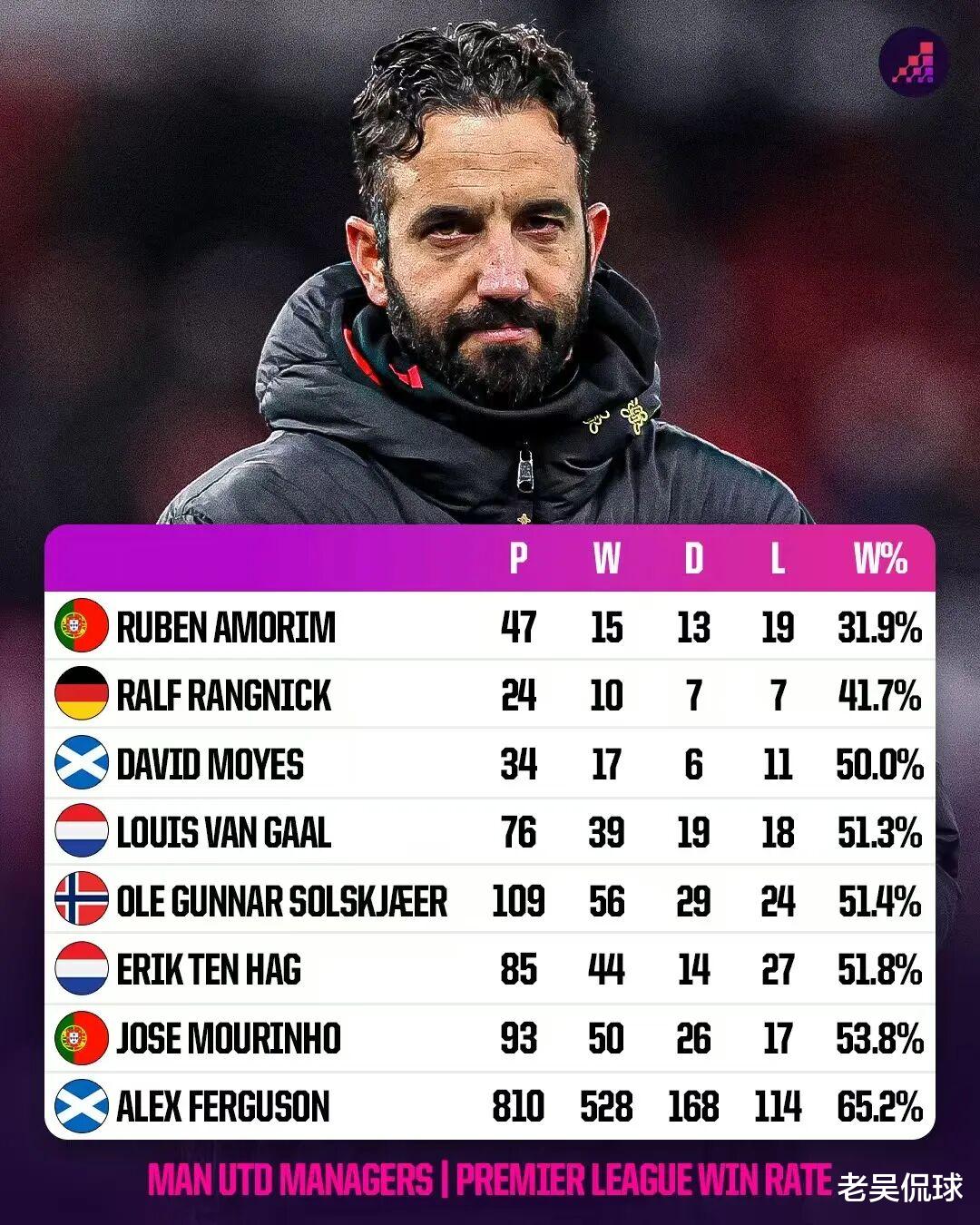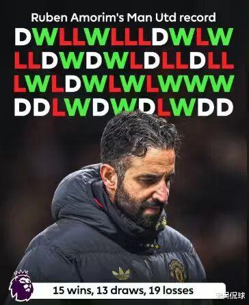 “非战之罪”或许更适用于马雷斯卡,阿莫里姆更像是被秋后算账。确实,之前濒临降级区不换帅,这会排名第6、跟前四只差3分却让他走人,赛季正中间又要重建,是部分球迷质疑红魔高层的原因。只是,阿莫里姆治下,曼联的总体战绩实在是无法让人肯定。联赛执教47场15胜13平19负,31.9%的胜率是后弗格森时代中断档的最差,之前最低的朗尼克都有41.7%,其他人都在5成出头。