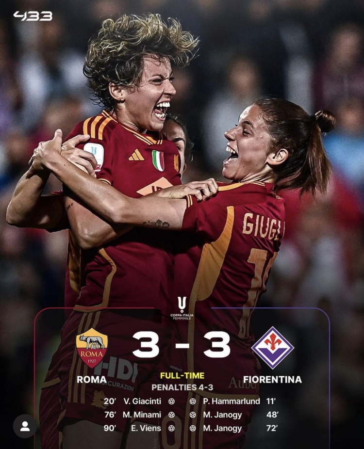 本场比赛双方常规时间战成3-3平,最终在点球大战罗马女足以4-3取胜夺得冠军。