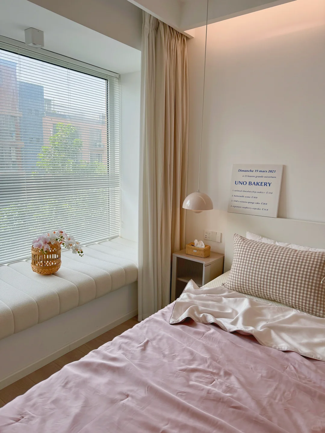 床越简单越好看,怎么搭配床品都不挑!我家窗帘飘窗垫床头柜四件套是不是很搭!奶fufu的!穿上我的小花👗睡衣收拾家去