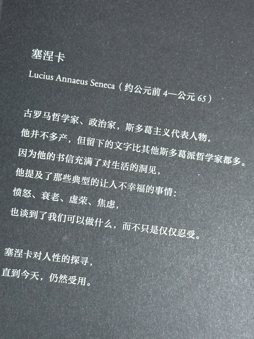 他历久弥新的作品,是一百多封写给朋友的书信《斯多葛主义者来信》,阐述了如何应对逆境,如何克服悲伤、焦虑和愤怒,如何将挫折转化为成长机会,如何认识友谊的真正本质等重要人生议题。