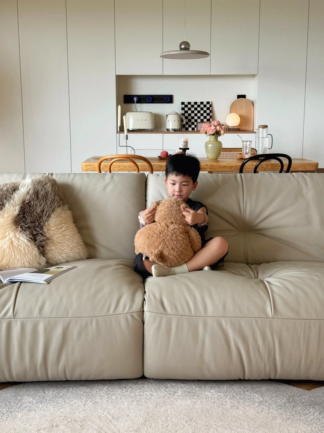 🍃客厅是我们除了睡眠时间外最常待的地方,沙发就成为了不可忽视的重要c位,我选择的是斯帝罗兰糯米糍沙发,米白色给房间添了些许法式的慵懒感,保留皮料的原生美感,触感如绒面亲肤。我选的2.84米长两段式分体模块设计也可以自由组合 对小户型也很友好