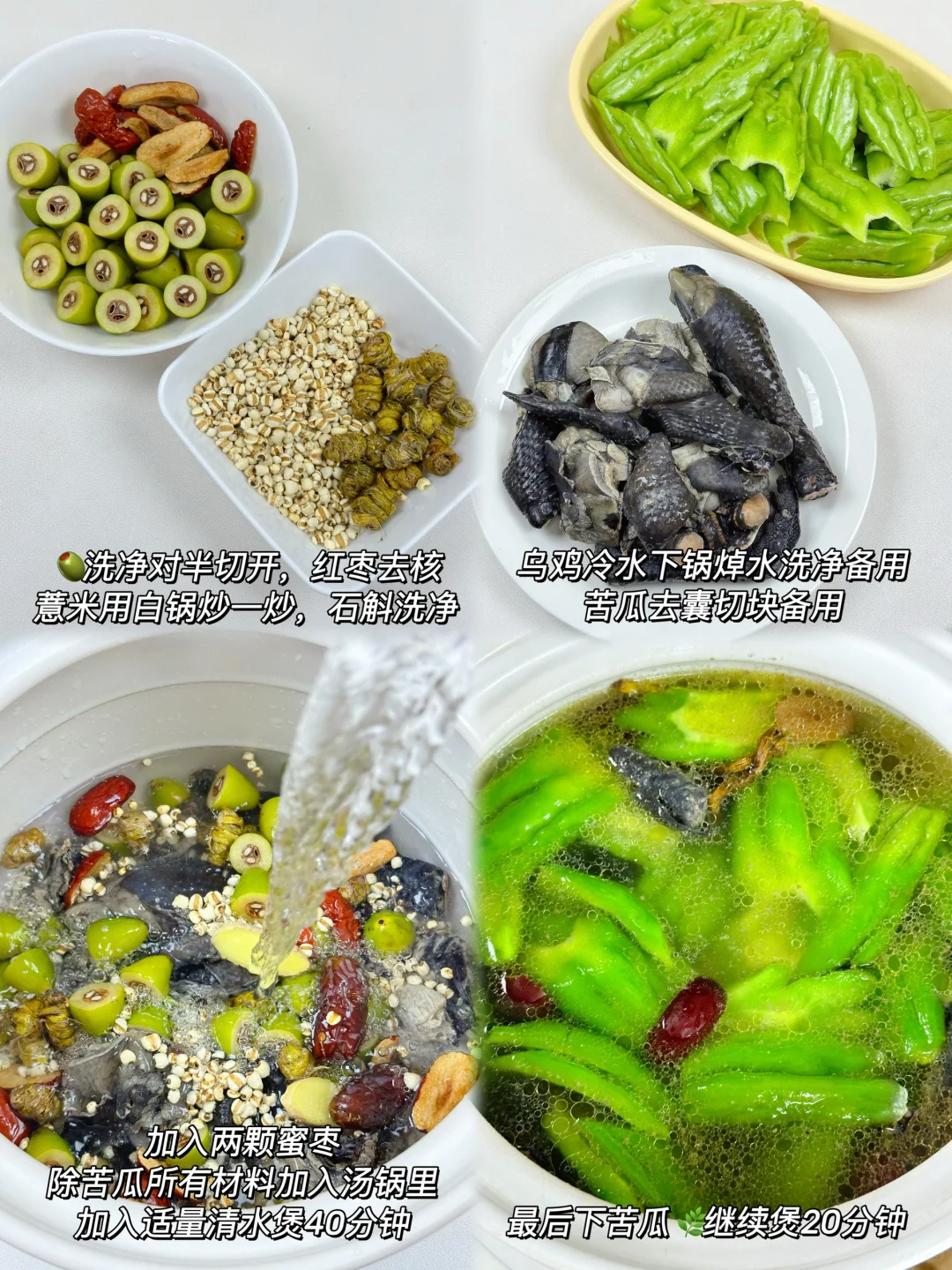 苦瓜、橄榄、薏米(炒)、石斛、乌鸡、红枣、姜片、蜜枣或椰枣