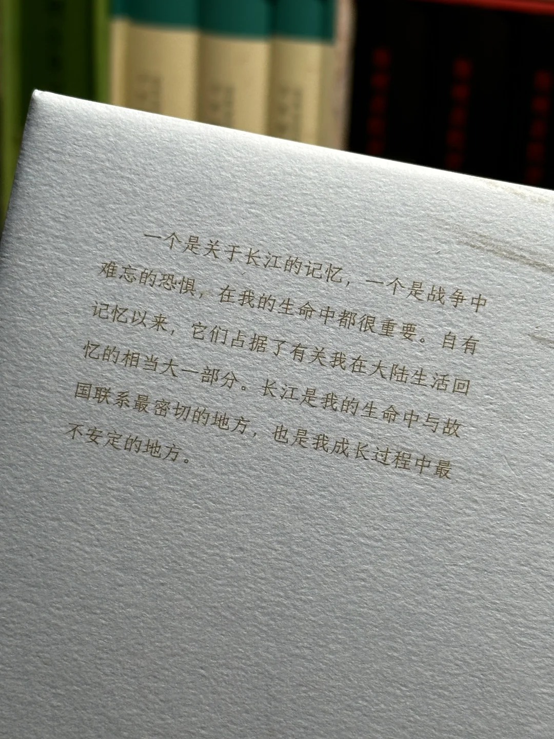 🍃“一个是关于长江的记忆,一个是战争中难忘的恐惧,在我的生命中都很重要。自有记忆以来,它们占据了有关我在大陆生活回忆的相当大一部分。长江是我的生命中与故国联系最密切的地方,也是我成长过程中最不安定的地方。”