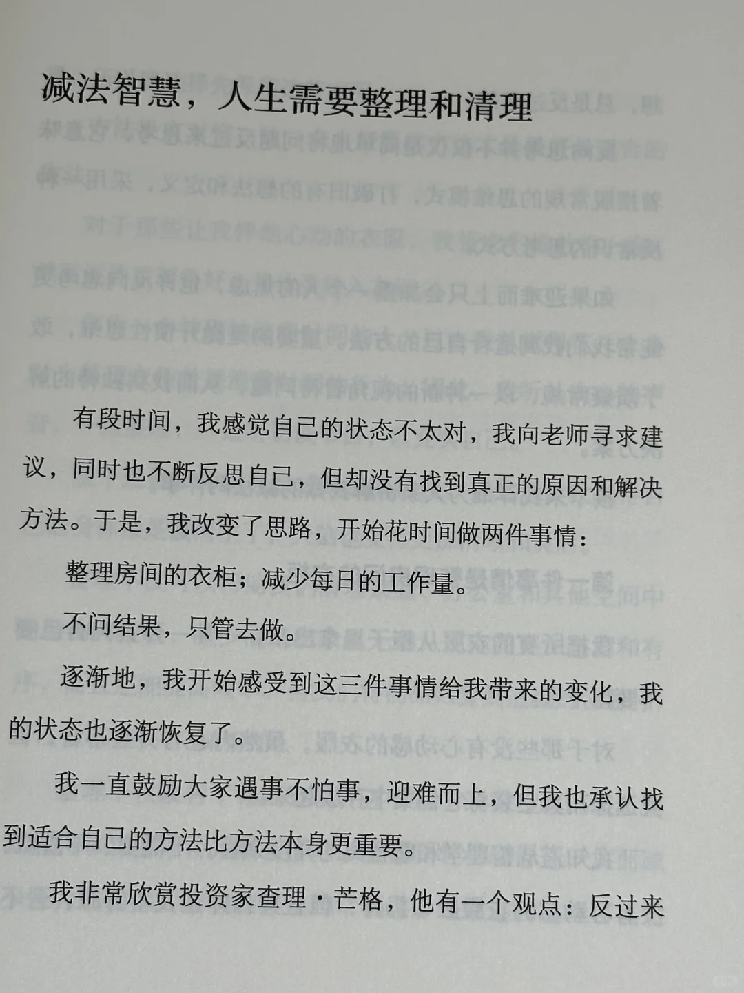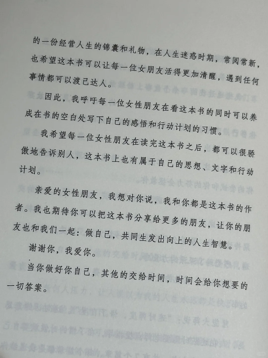 书中文字质朴真诚,阅读的感觉就像是在一个微风和煦的午后,和一位睿智优雅的大姐姐坐在一起絮絮畅谈,听她从容地、毫无保留地分享自己的人生经验,享受一场由内而外的精神洗礼,身心舒畅。
