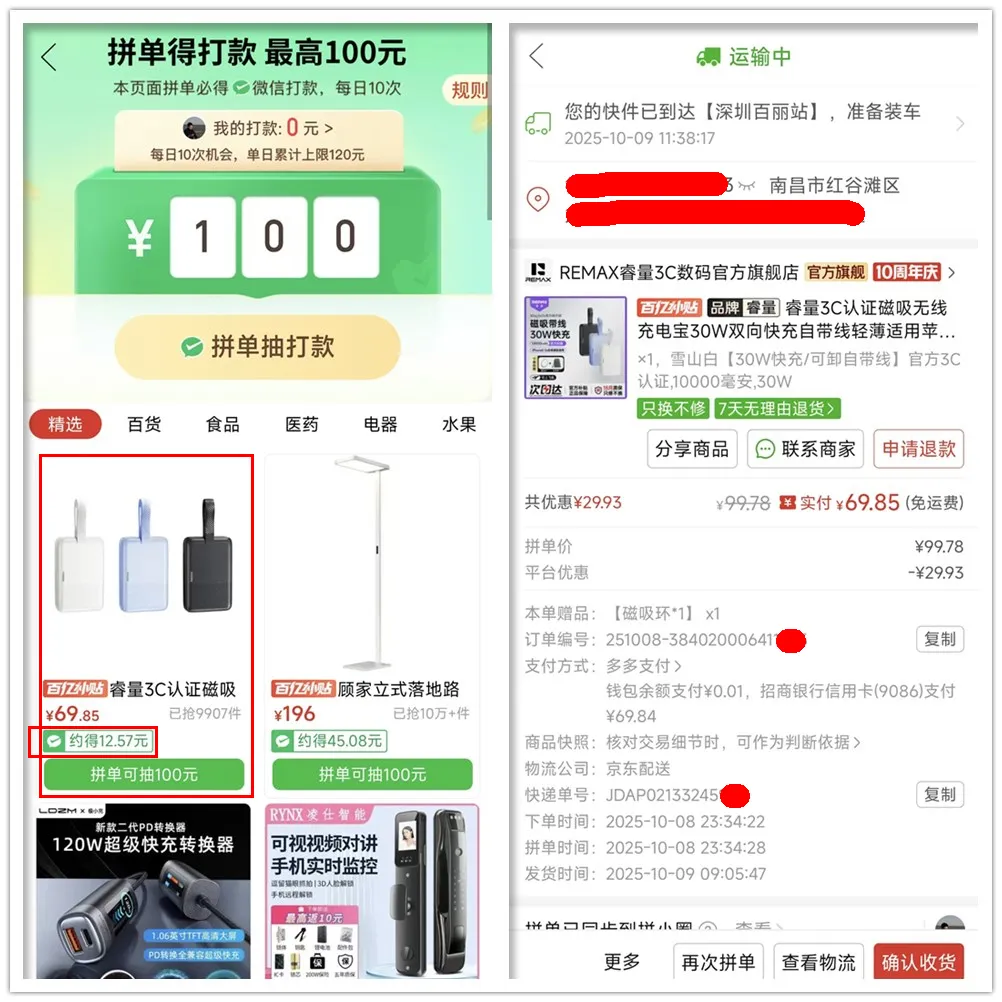 说下这价格怎么实现的,这个睿量MCP-1是刚出的新品,狗东那边最低卖129元。而PDD这边先搜“减减减”进入整点抢券界面,领一张7折卡,再退回主页搜“抽100”进入精选界面,从这个界面下单可以返12.57元。