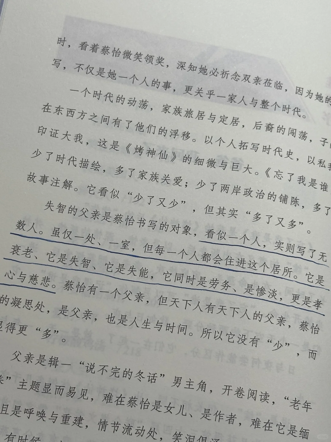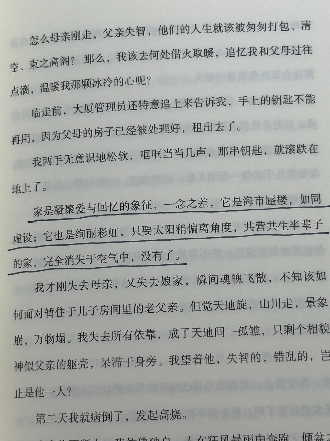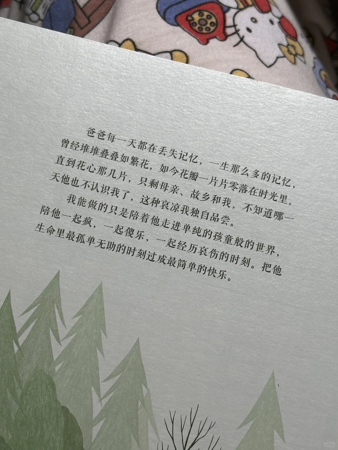 “爸爸每一天都在丢失记忆,一生那么多的记忆,曾经堆堆叠叠如繁花,如今花瓣一片片零落在时光里,直到花心那几片,只剩母亲、故乡和我,不知道哪一天他也不认识我了,这种哀凉我独自品尝。”