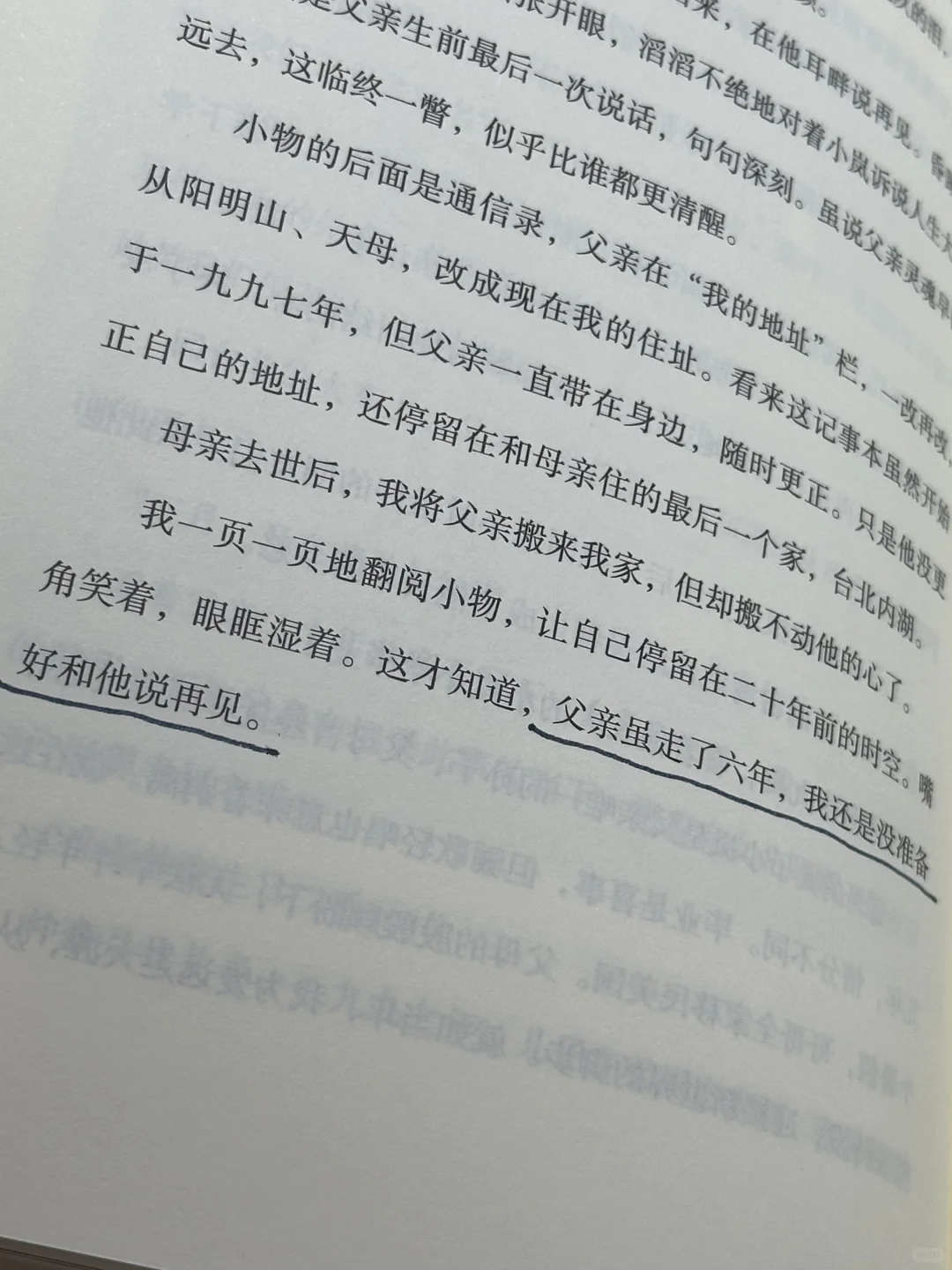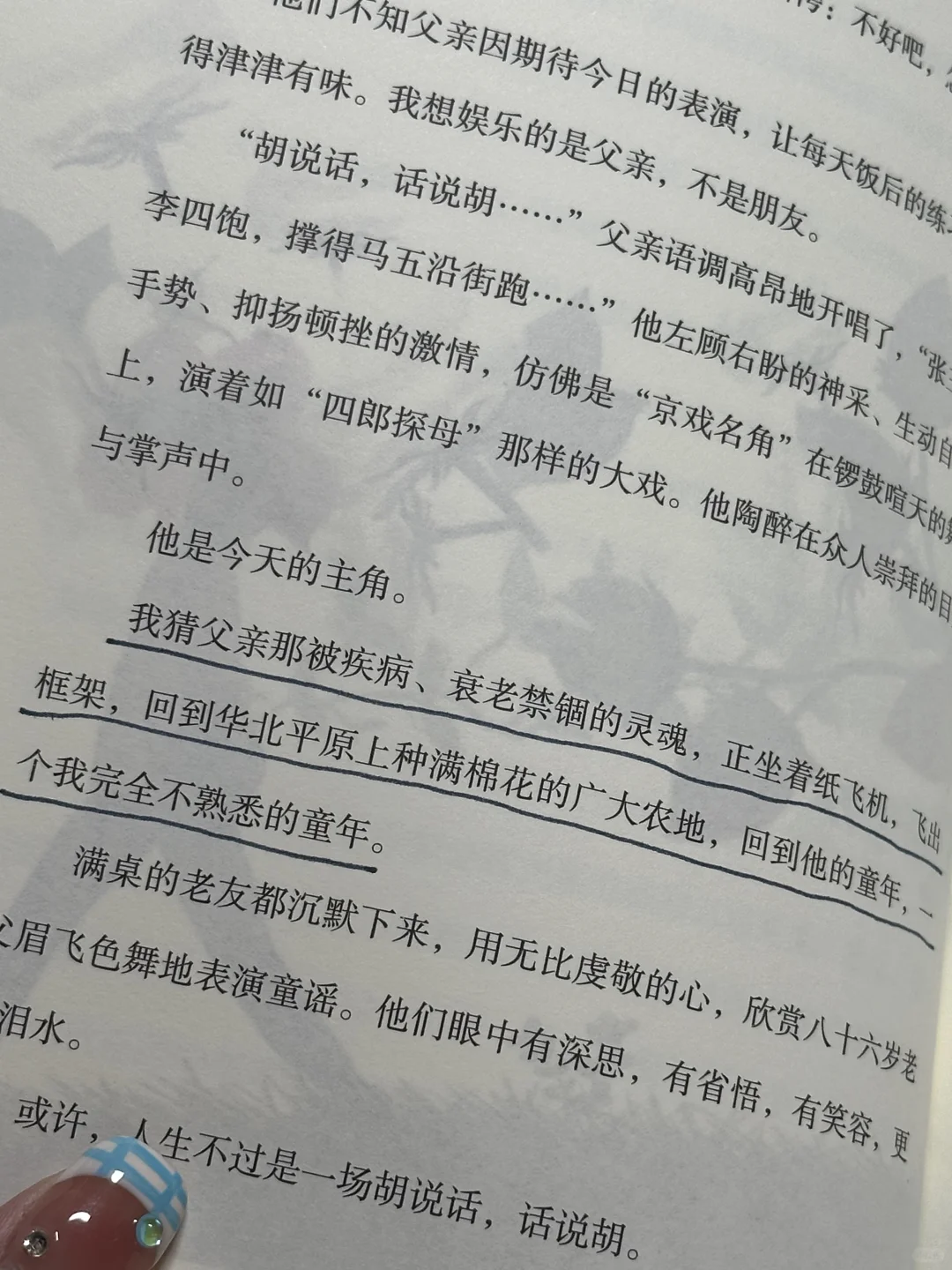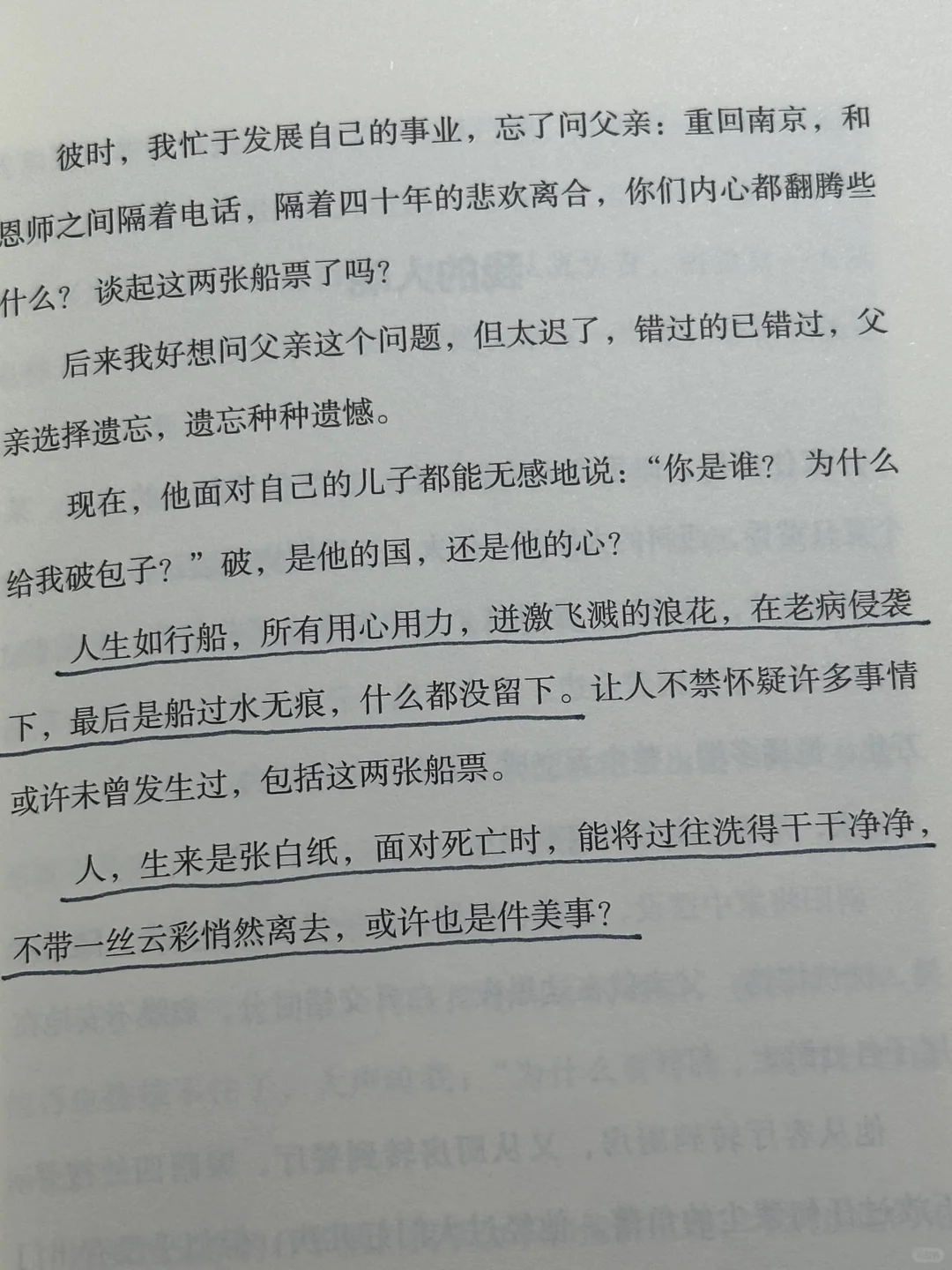 “爸爸每一天都在丢失记忆,一生那么多的记忆,曾经堆堆叠叠如繁花,如今花瓣一片片零落在时光里,直到花心那几片,只剩母亲、故乡和我,不知道哪一天他也不认识我了,这种哀凉我独自品尝。”