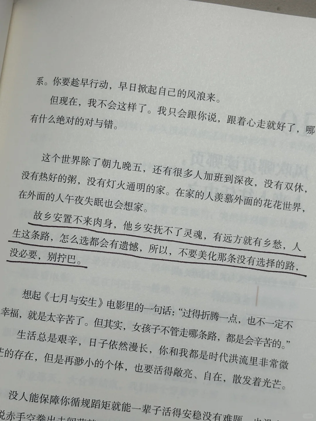 故乡安置不来肉身,他乡安抚不了灵魂,有远方就有乡愁,人生这条路,怎么选都会有遗憾,所以,不要美化那条没有选择的路,没必要,别拧巴。