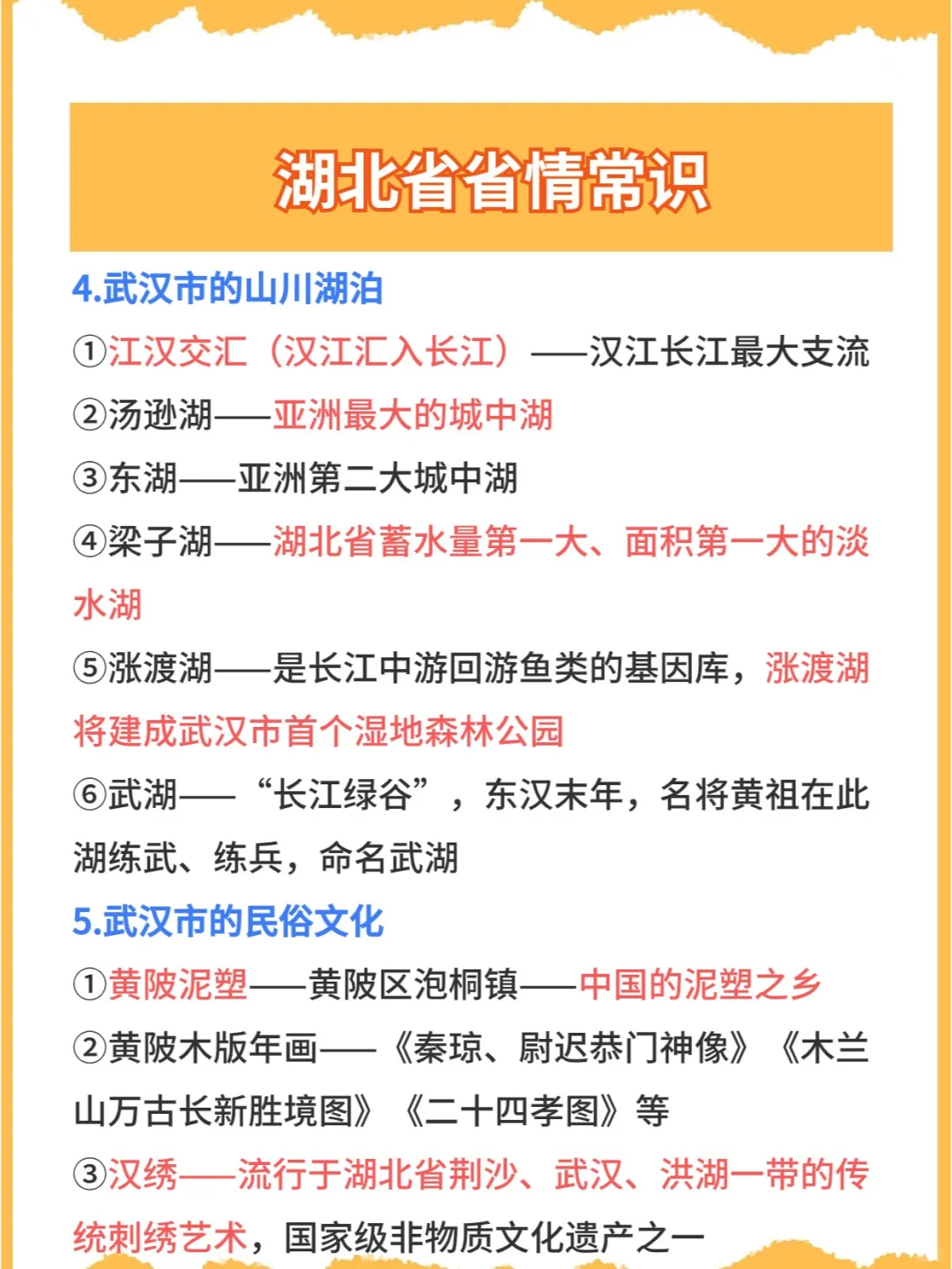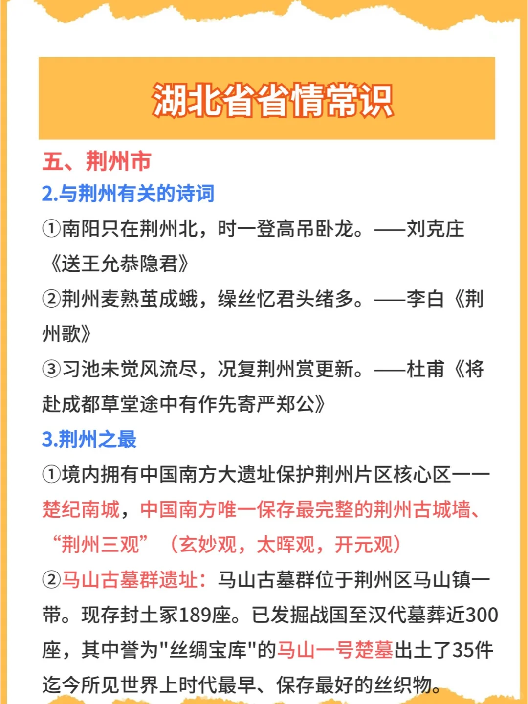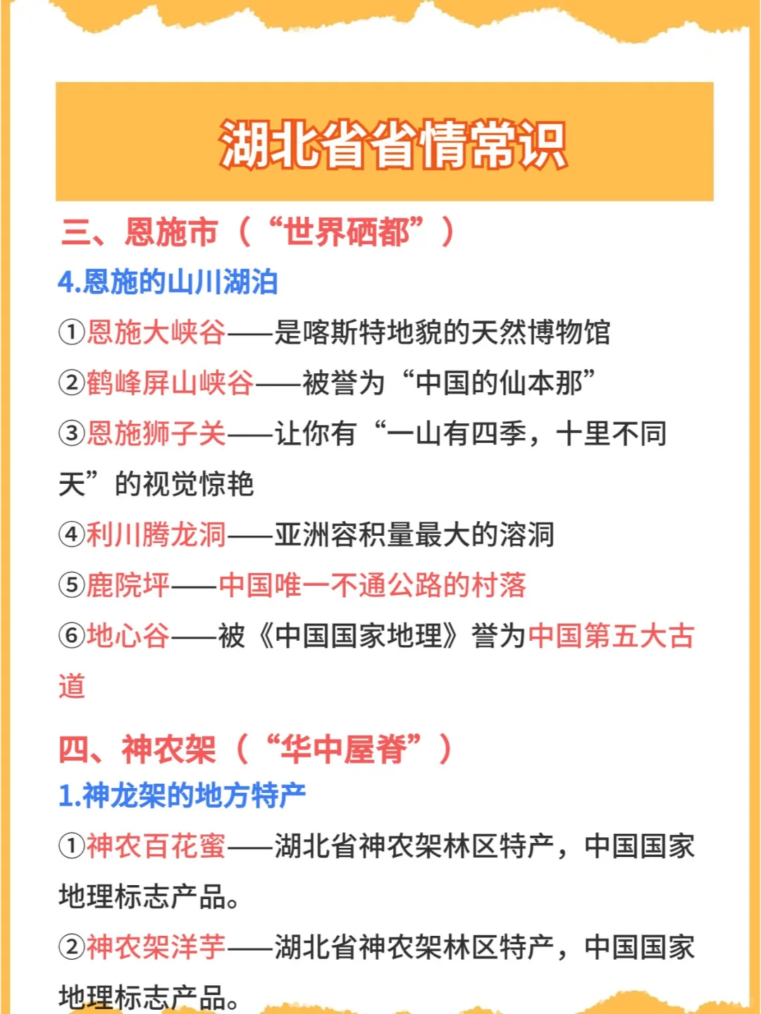 湖北省省情来啦(考试专用版),教师统招/省考/事业编等等考试都有可能会考察到本省的省情,里面也涉及到了很多常识点,考前赶紧看一眼。 💯一、武汉市(“百湖之市”) 💯二、黄石市(“江南明珠”) 💯三、恩施市(“世界硒都”) 💯四、神农架(“华中屋脊”) ....
