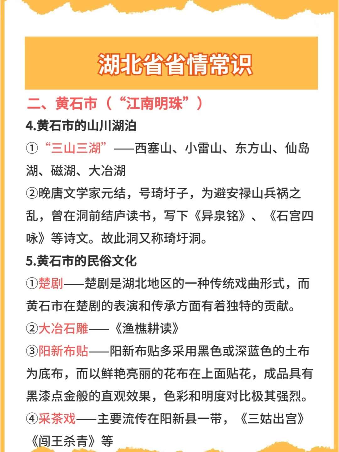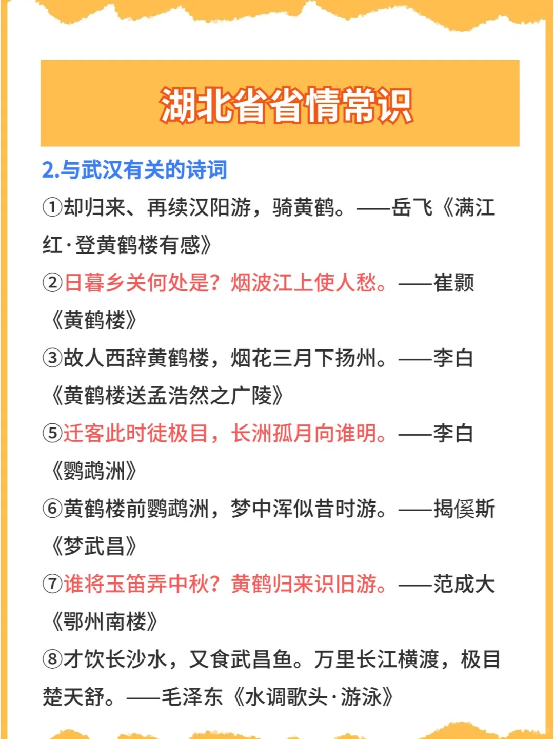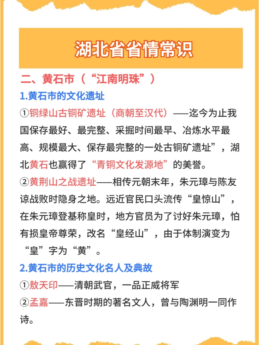 湖北省省情来啦(考试专用版),教师统招/省考/事业编等等考试都有可能会考察到本省的省情,里面也涉及到了很多常识点,考前赶紧看一眼。 💯一、武汉市(“百湖之市”) 💯二、黄石市(“江南明珠”) 💯三、恩施市(“世界硒都”) 💯四、神农架(“华中屋脊”) ....