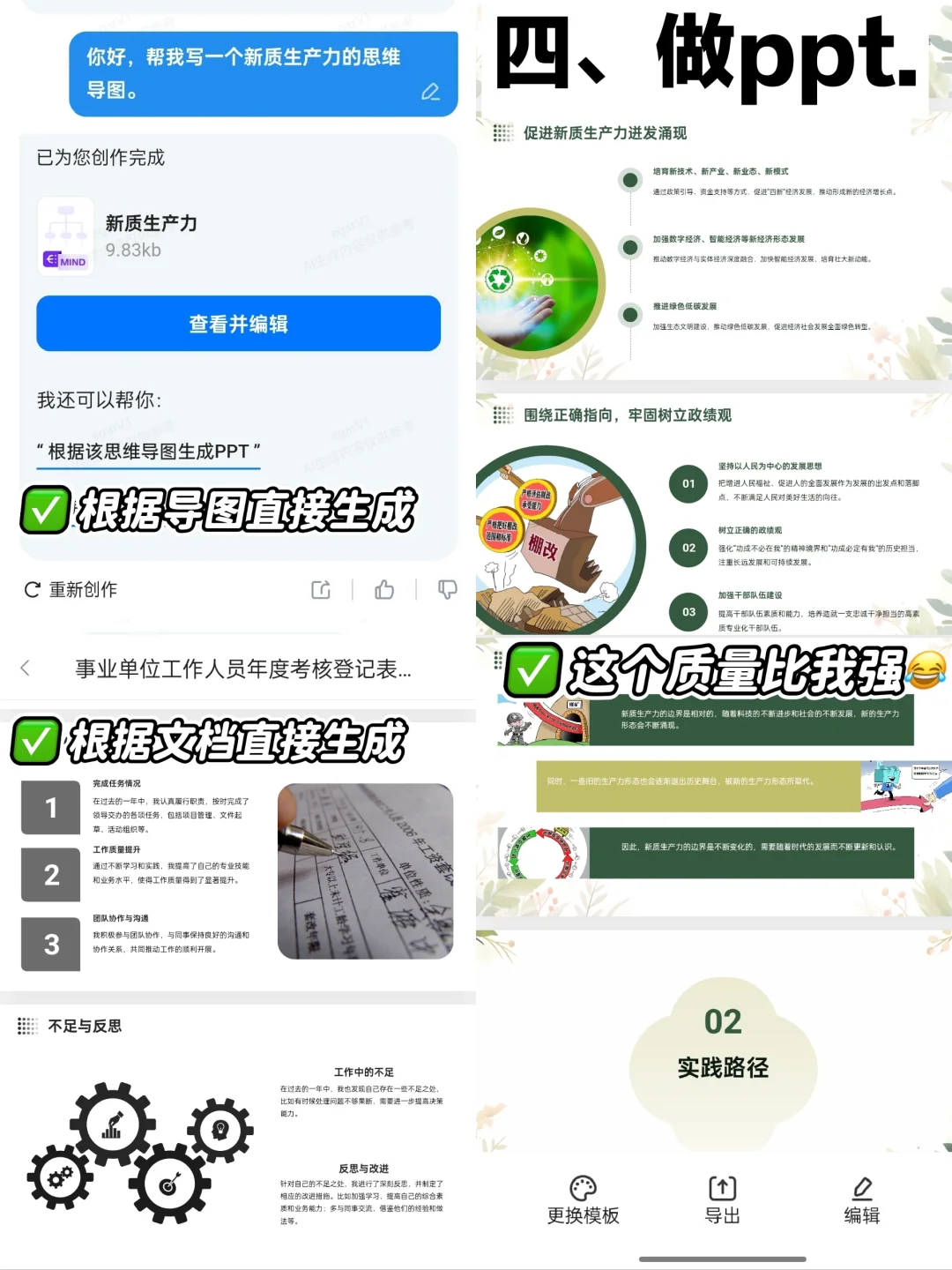 在这方面它同样是个得力助手,可以输入主题直接生成PPT,或者根据文档或思维导图转PPT。这意味着,无需花费大量时间在设计和排版上,只需专注于内容的打磨,就能轻松制作出高质量的PPT。(可见图解)