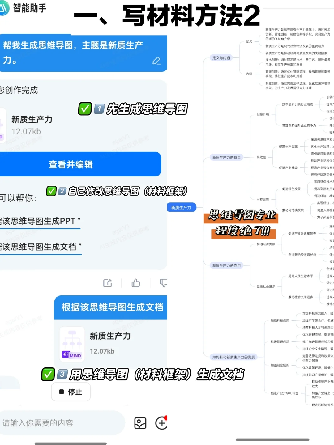 ✔️搭起材料框架。大材料可以先用思维导图功能一键生成文章大纲,自己对AI生成的大纲进行丰富、编辑,一键转为文档。也可以用研报生成功能,引用权威数据,生成专业话术,可用于写作参考【详见图解】