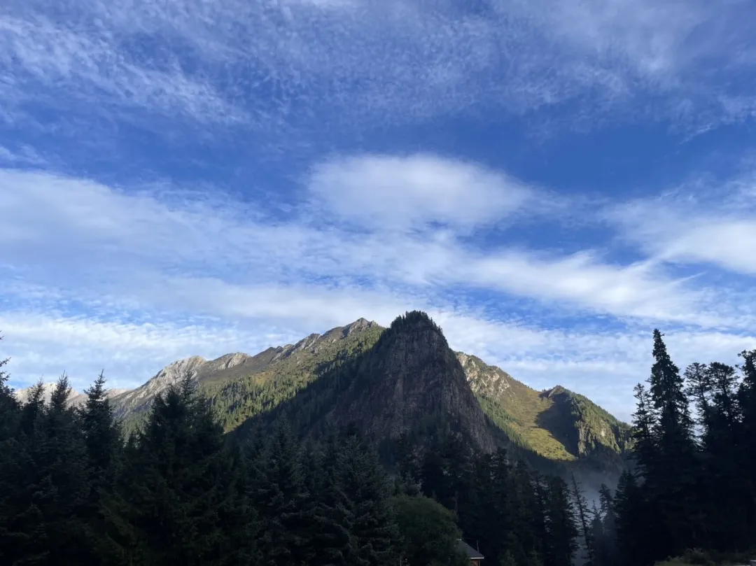 到原始森林大概要开半个小时,下车后,温度骤降,我们一家人开始穿衣,我穿好外套,媳妇穿了件夹克,还觉得冷,加上冲锋衣的内胆,才觉得暖和。我们稍作休息,没有进入原始森林深处,在外面看山,山形如同一柄柄利剑,直穿云层,远处的高山不知为何,顶部光秃秃,露出灰白色的石壁,阳光出来,剑更锋利了。