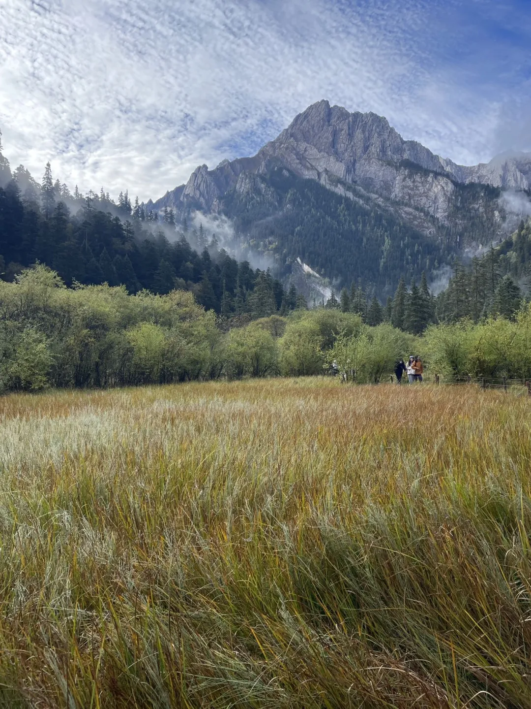 九寨沟曾经有九个藏族村寨,名字由此而来。现在开放了三个,我们在车上看见的寨子,已是现代化建筑,失去了原有的特色,大多是景区招财寨。国庆节,九赛沟有 4.1 万人,沿途一直向上,到达诺日朗中转站,导游说,为防止人流聚集太多,需要分流,我们分到原始森林。原始森林海拔 3080 米,是九赛沟第二高的景点。
