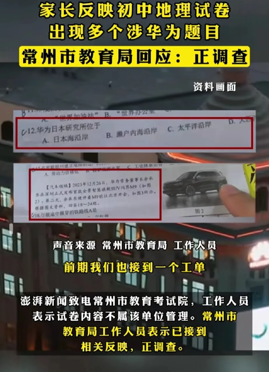 近日,有网友发视频爆料常州地理会考试卷多题涉华为话题。不过没多久,该视频就被删除。6月27日,教育局回应:以华为精神作为主情境设计试卷,课程方案和标准鼓励讲述中国故事。有支持这一做法的网友评论:以前出现的都是外国品牌,为什么就没人质疑,出现中国品牌怎么就成了罪过了?也有网友质疑:大家为什么不想想,地理科目为什么要考华为总部在哪里?友友们,你们怎么看?