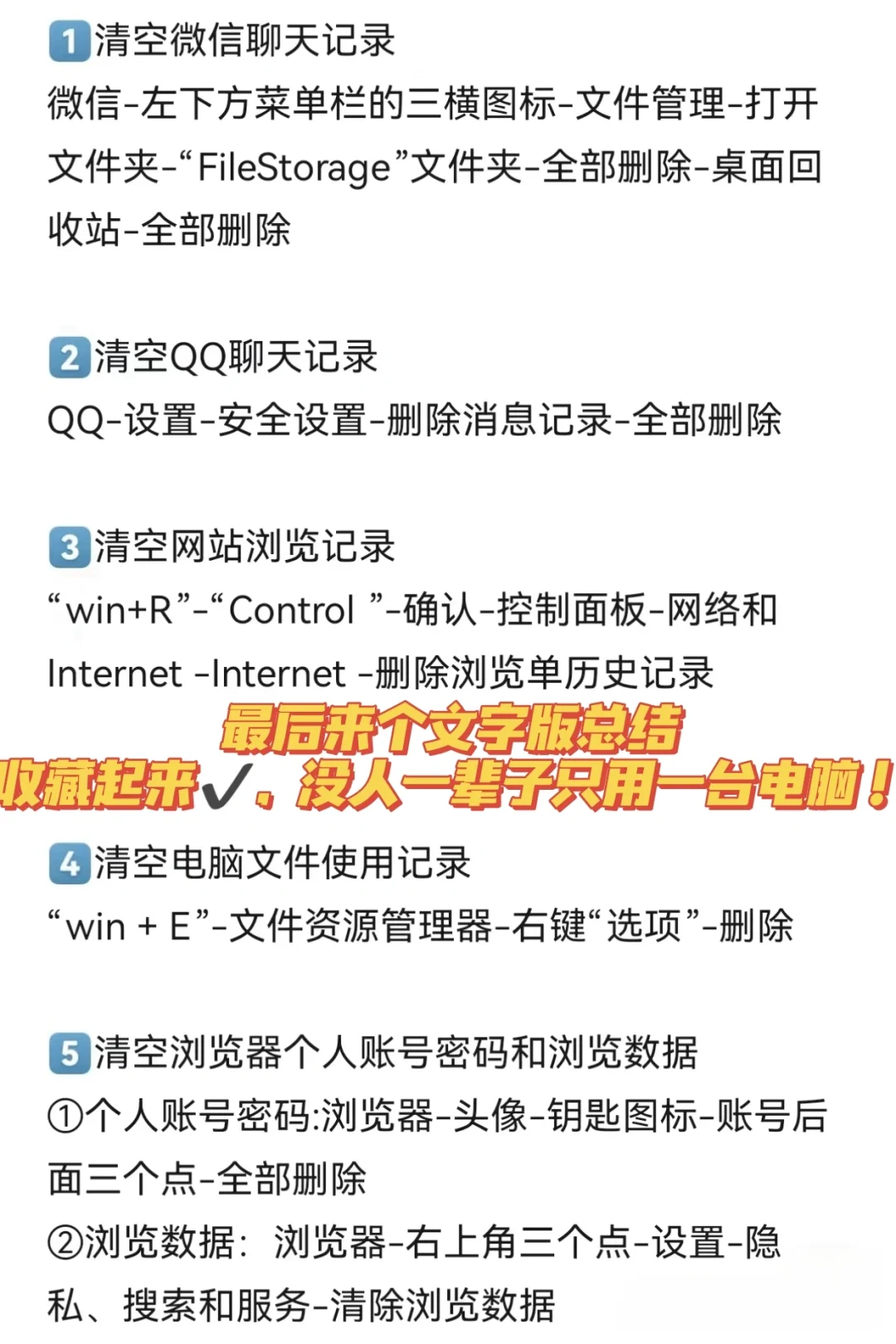 于是想到了我之前整理的《换电脑如何正确删除个人痕迹步骤》,在面临[向右R]换电脑(系统)、工作调动、升职甚至离职时,能用正确方法删除个人信息才行!(分享给大家!见上图)