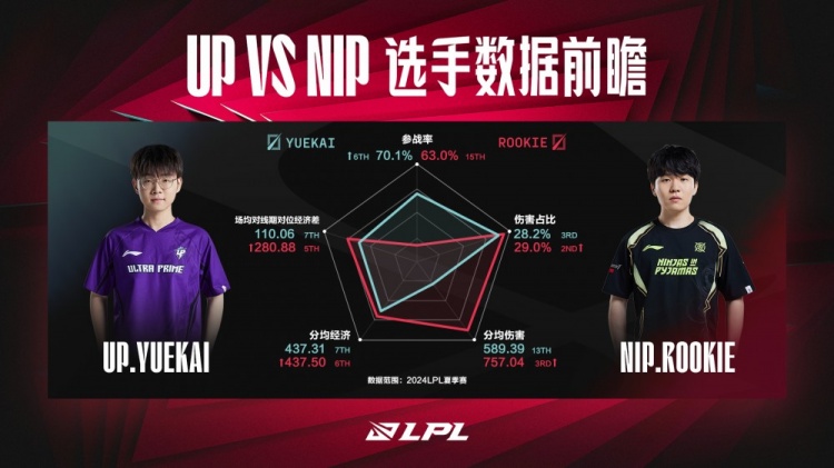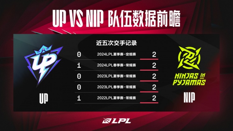 直播吧6月29日讯英雄联盟赛事数据官博更新,发布2024LPL夏季赛定组赛UP对战NIP数据前瞻,原文如下: