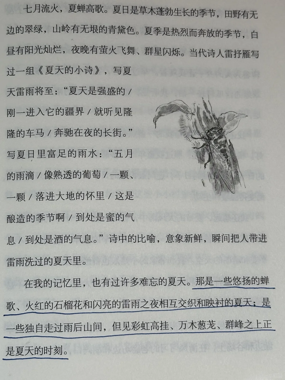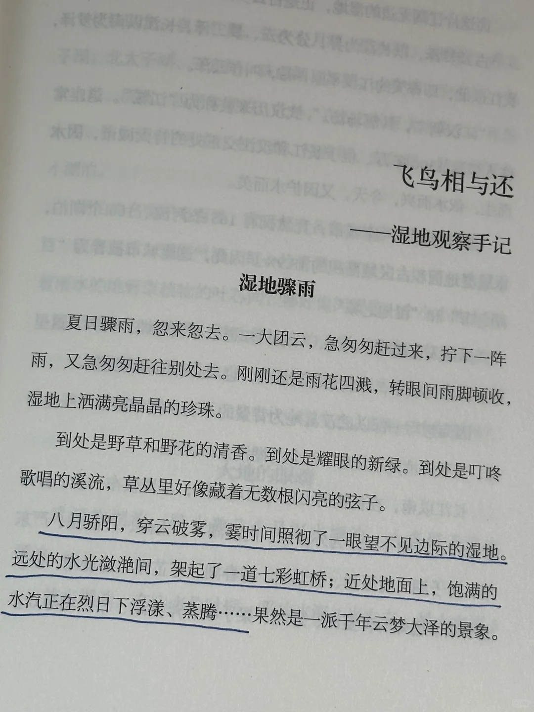 “夏日骤雨,忽来忽去。一大团云,急匆匆赶过来,拧下一阵雨,又急匆匆赶往别处去。刚刚还是雨花四溅,转眼间雨脚顿收,湿地上洒满亮晶晶的珍珠。到处是野草和野花的清香。到处是耀眼的新绿。到处是叮咚歌唱的溪流,草丛里好像藏着无数根闪亮的弦子。”