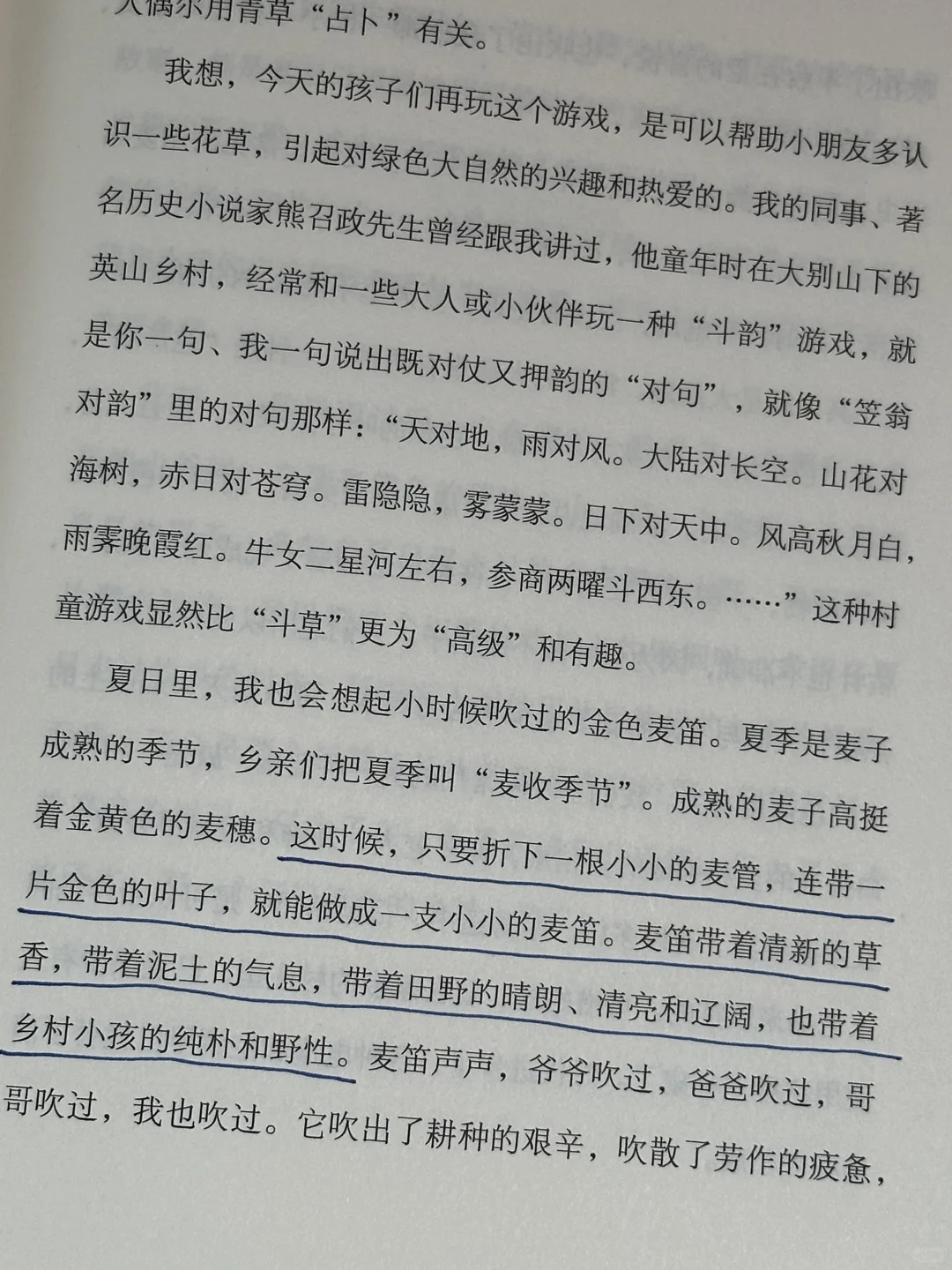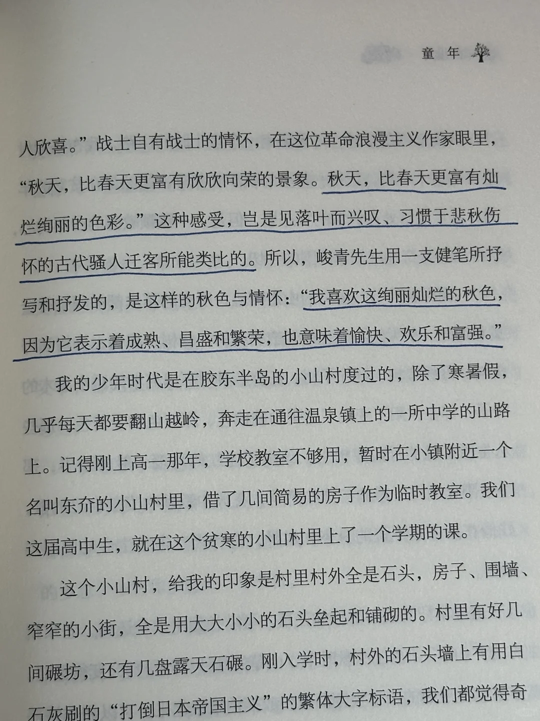 “一到深秋时节,弯弯的山道两边,所有的草木都被晒染得金黄和通红。秋天的阳光也是通透明亮的。榛树、枫树、柞树和野樱树、野板栗树、野柿子树,还有各种叫不出名字的矮小灌木的叶子,都在秋阳下变成丁透明的琥珀色、深红色和金黄色。那些丛生而多棘的野酸枣树上,结满了通红的玛瑙般的酸枣;那些被阳光晒得千透的芒草和茅草,在风中默默吹奏着自己的歌,好像在用不屈不挠的身姿和风骨,向秋天宣告着生命的坚忍与顽强。”