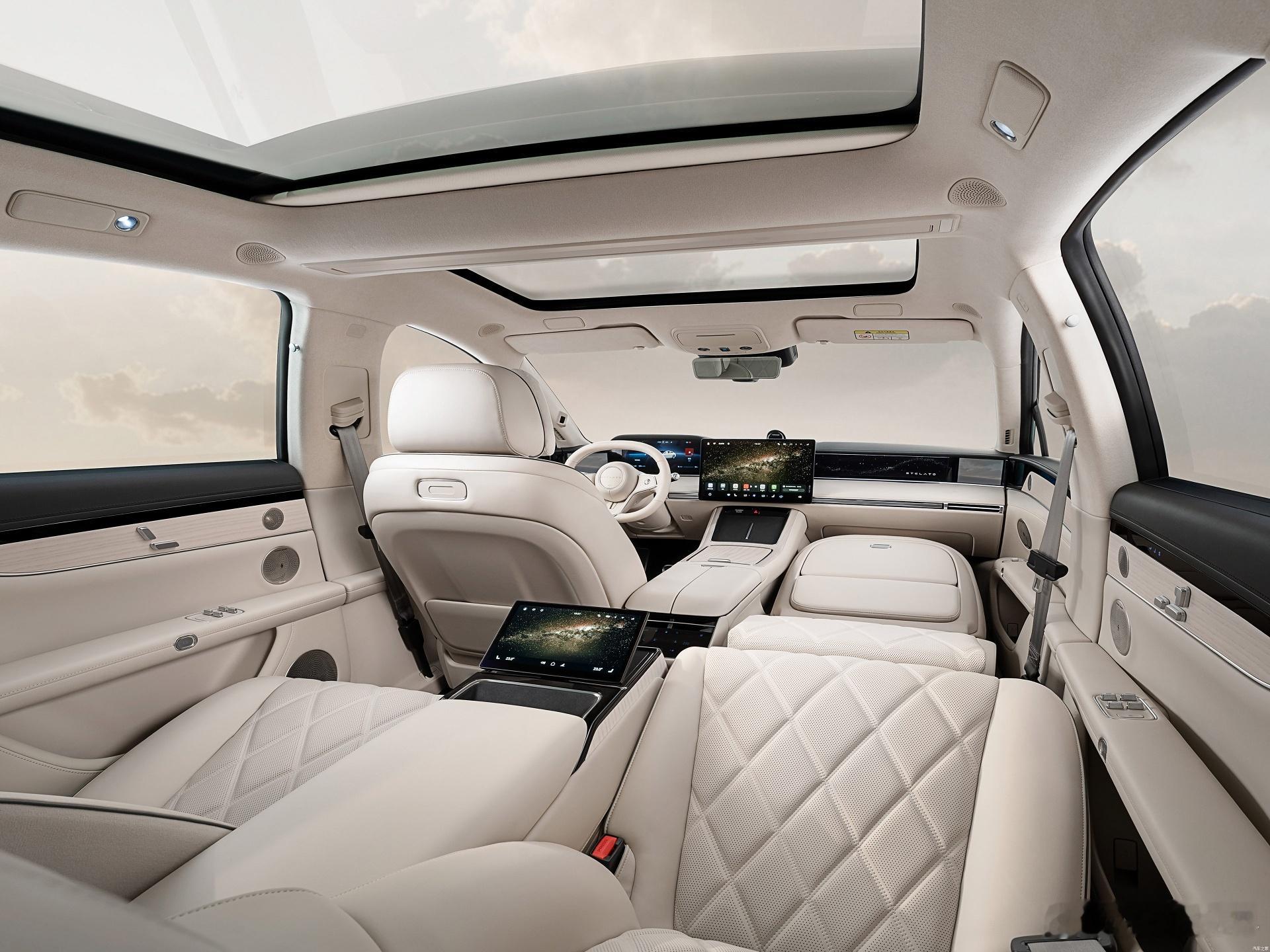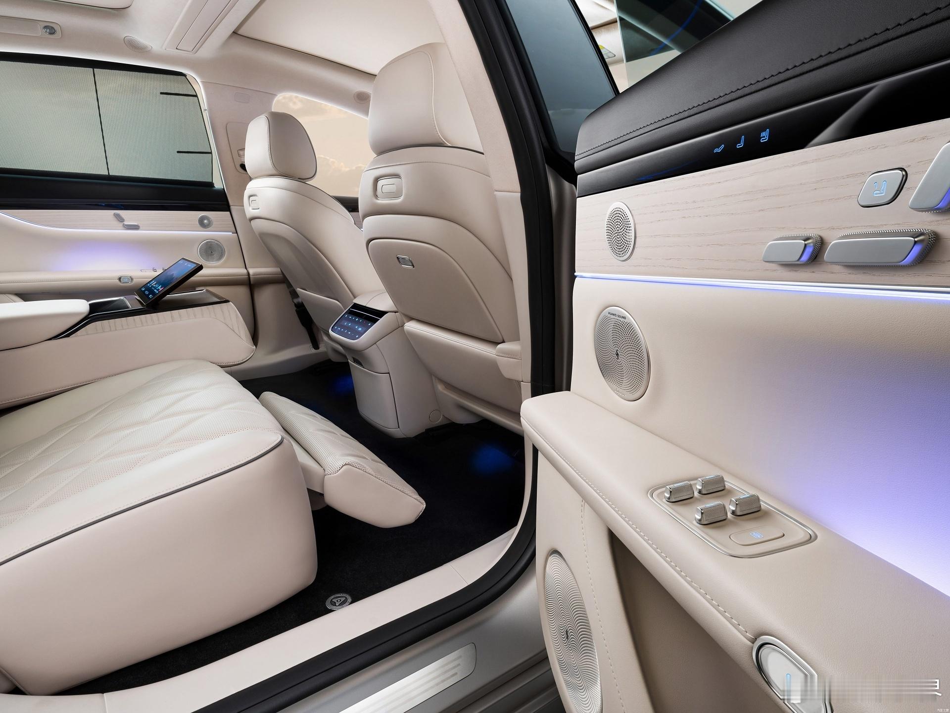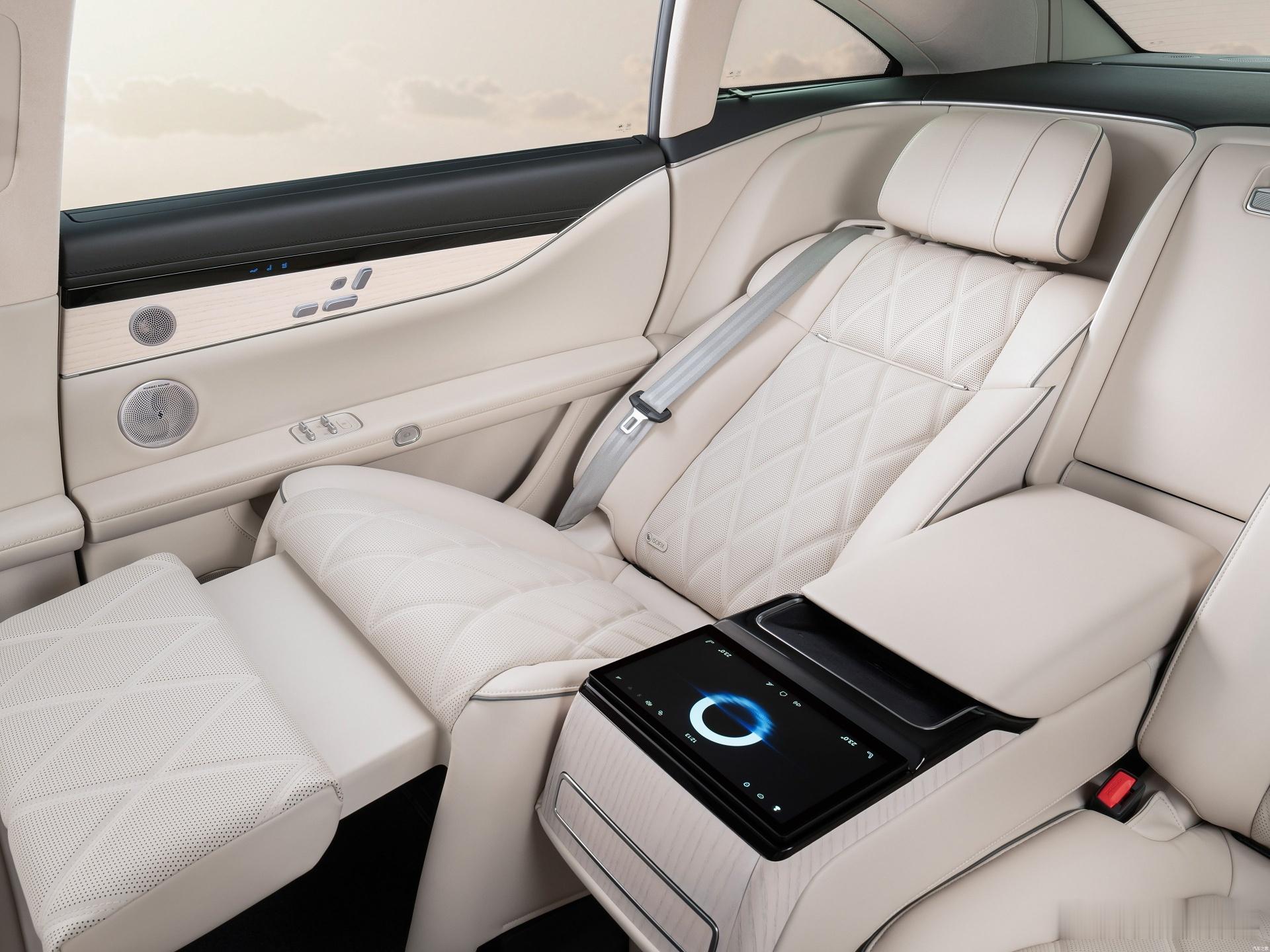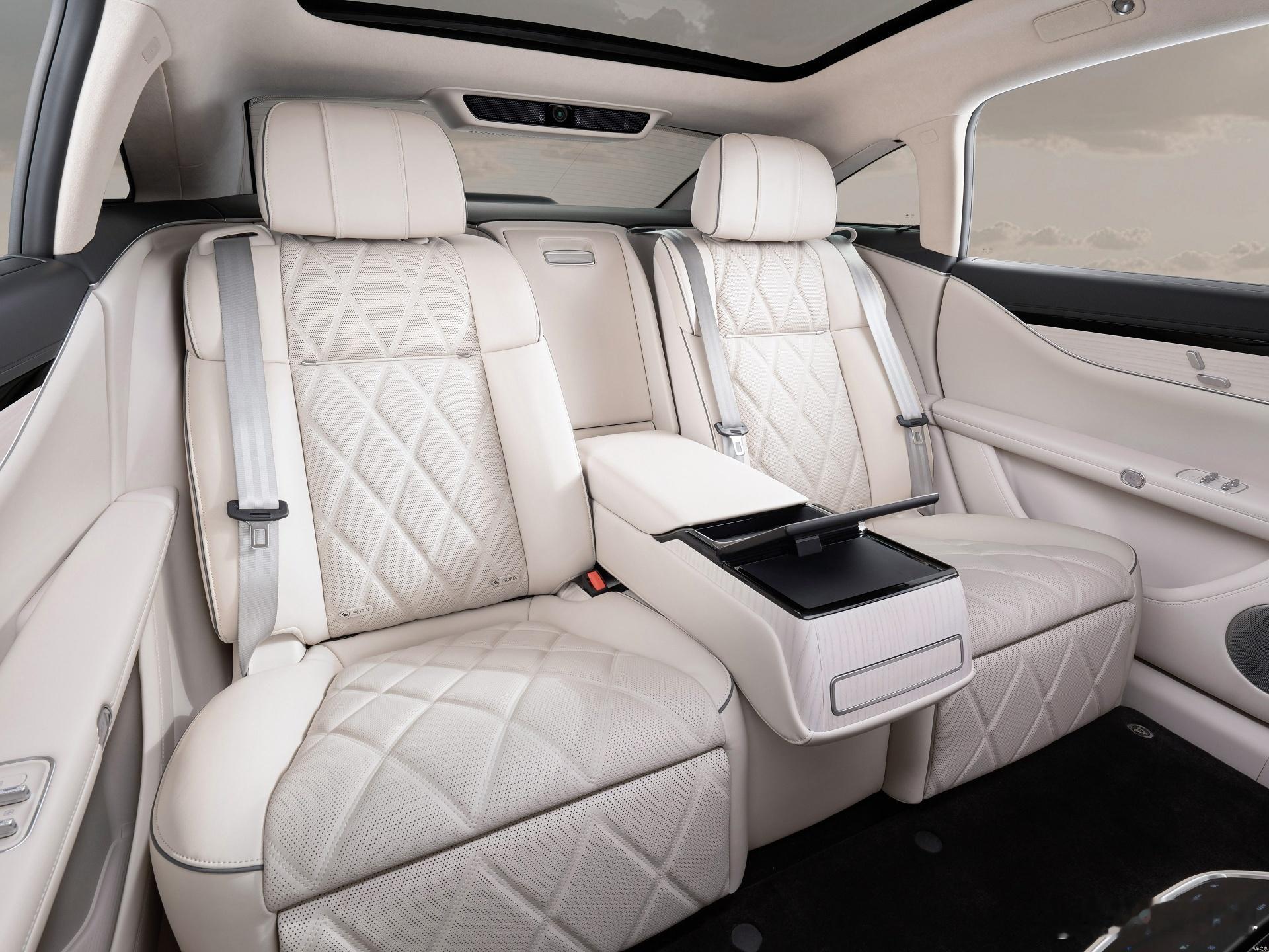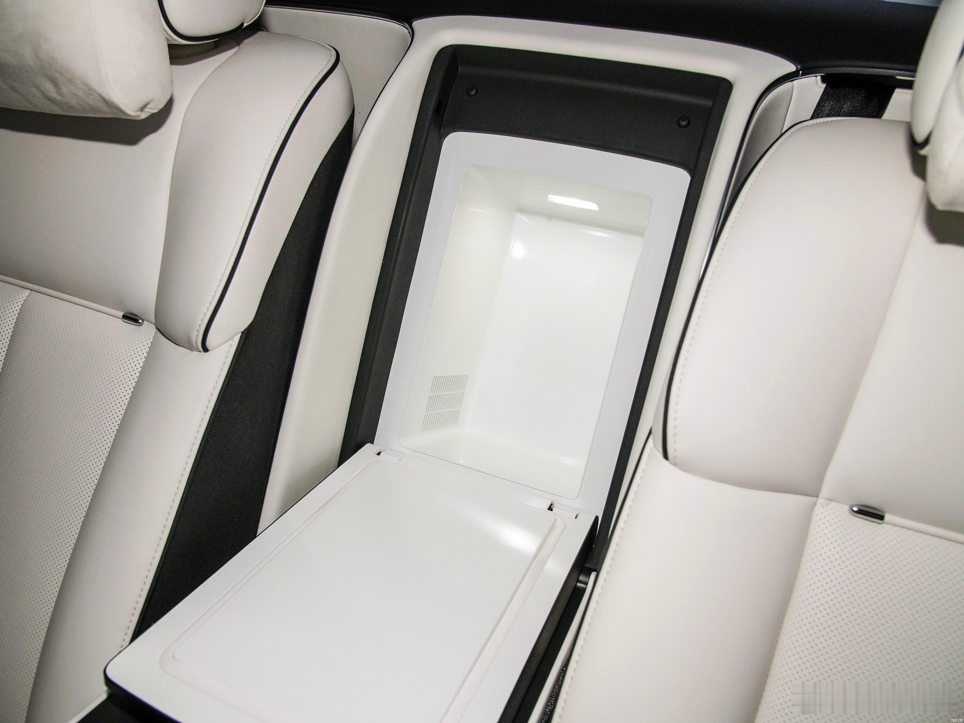 中央扶手电动收放,且带有50w无线充和记忆电调的车载平板,后方还有香槟冰箱;