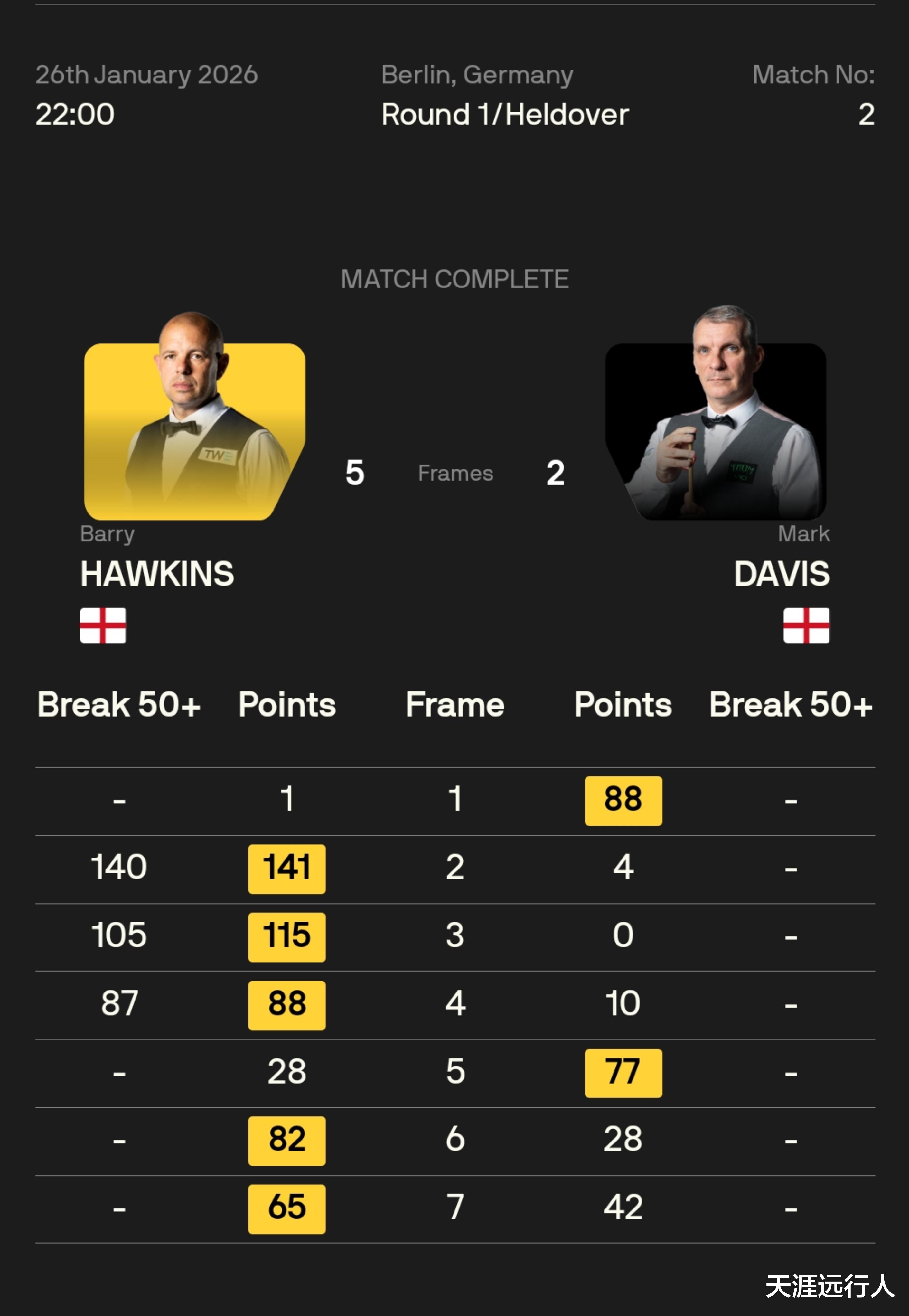 年过半百的马克·戴维斯,多次上手88-1先拔头筹,霍师傅连打140、105分两杆破百和单杆87,反超大比分,戴维斯拿下第五局,霍金斯缠斗中连赢两局,锁定32强。