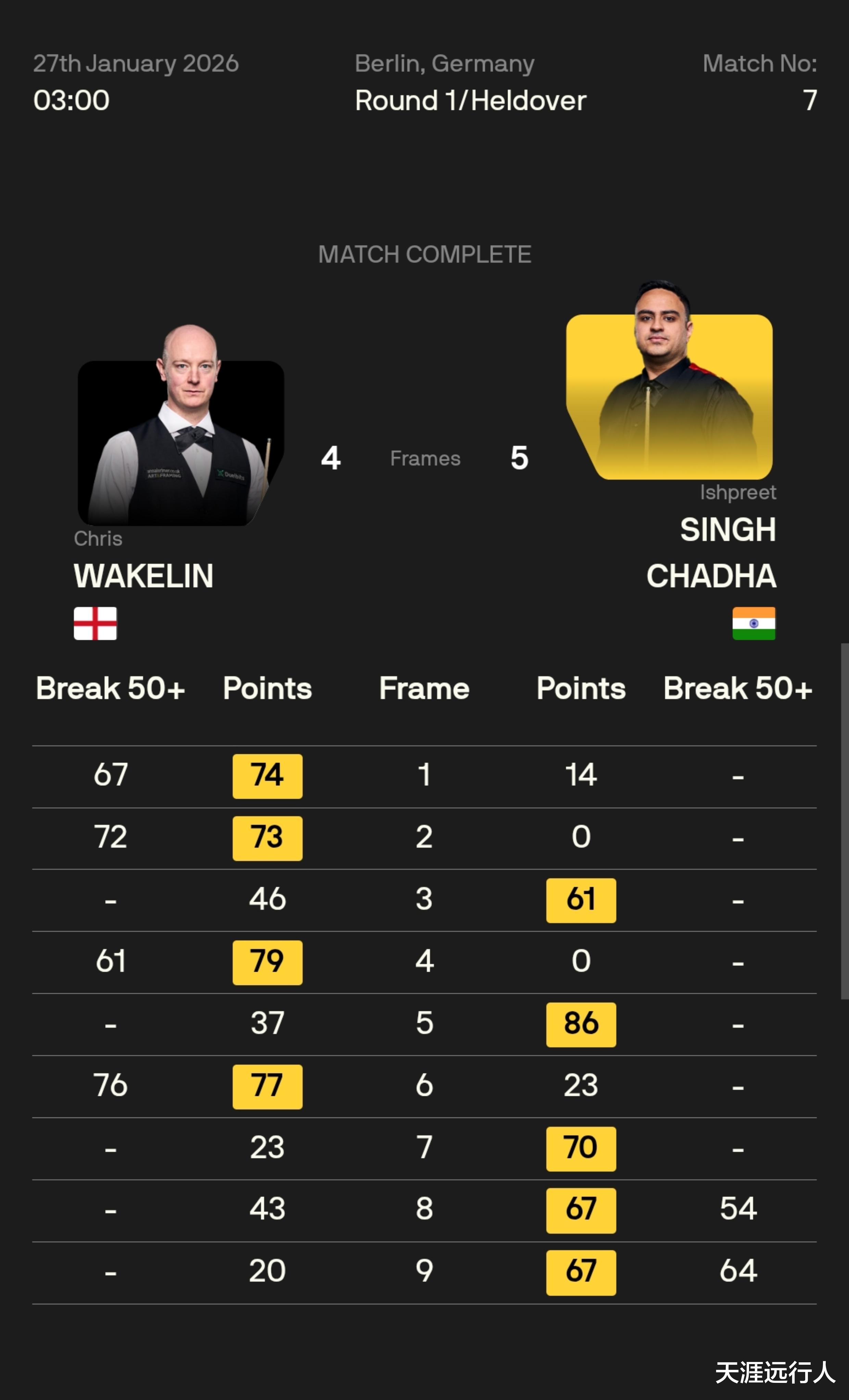 新晋147先生、最新排名赛两冠王克里斯·韦克林,本场比赛开场状态不错,打出四杆单杆60+,先后以2-0、3-1领先,并以4-2先达赛点,赛前刚刚注销电竞账号的前印度电竞高手、斯诺克世界排名第65身处降级区的辛格·查达,奋力打出自己全场唯二的两杆50+,一波三连鞭,强势逆转前十六种子,在自己本赛季的保级之路上,迈出坚实的一步。
