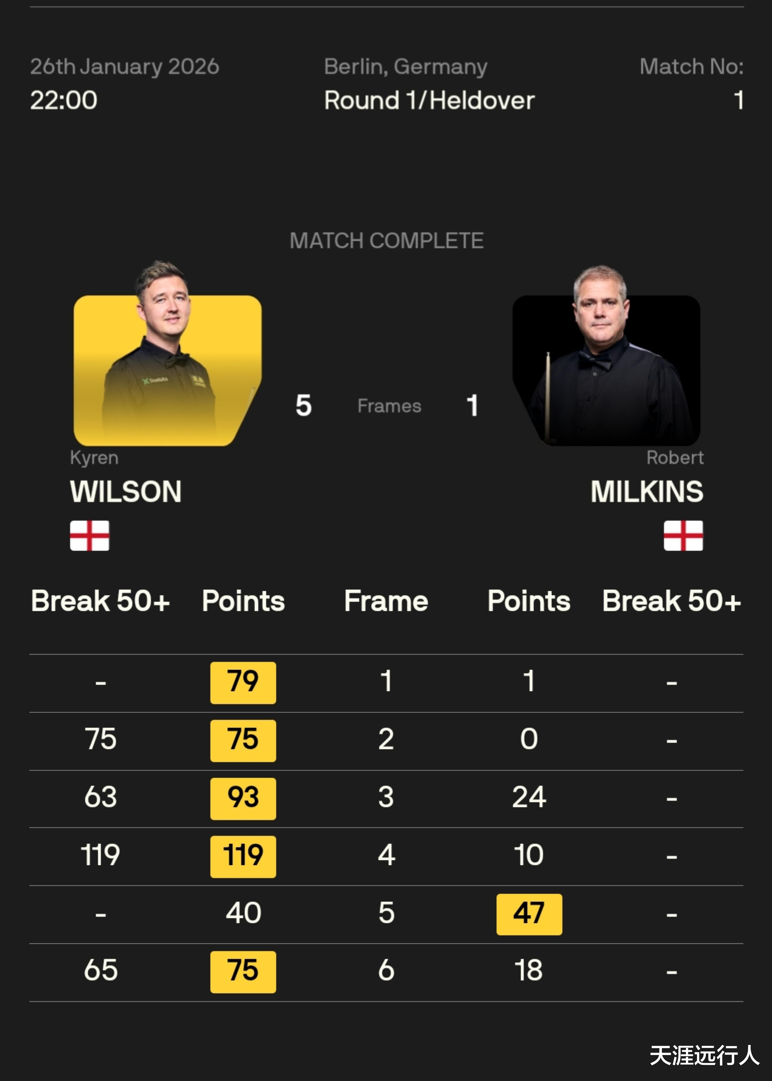 卫冕冠军凯伦·威尔逊打出一杆破百、三杆单杆60+,老米仅在第五局的乱局中以47-40赢下一局。