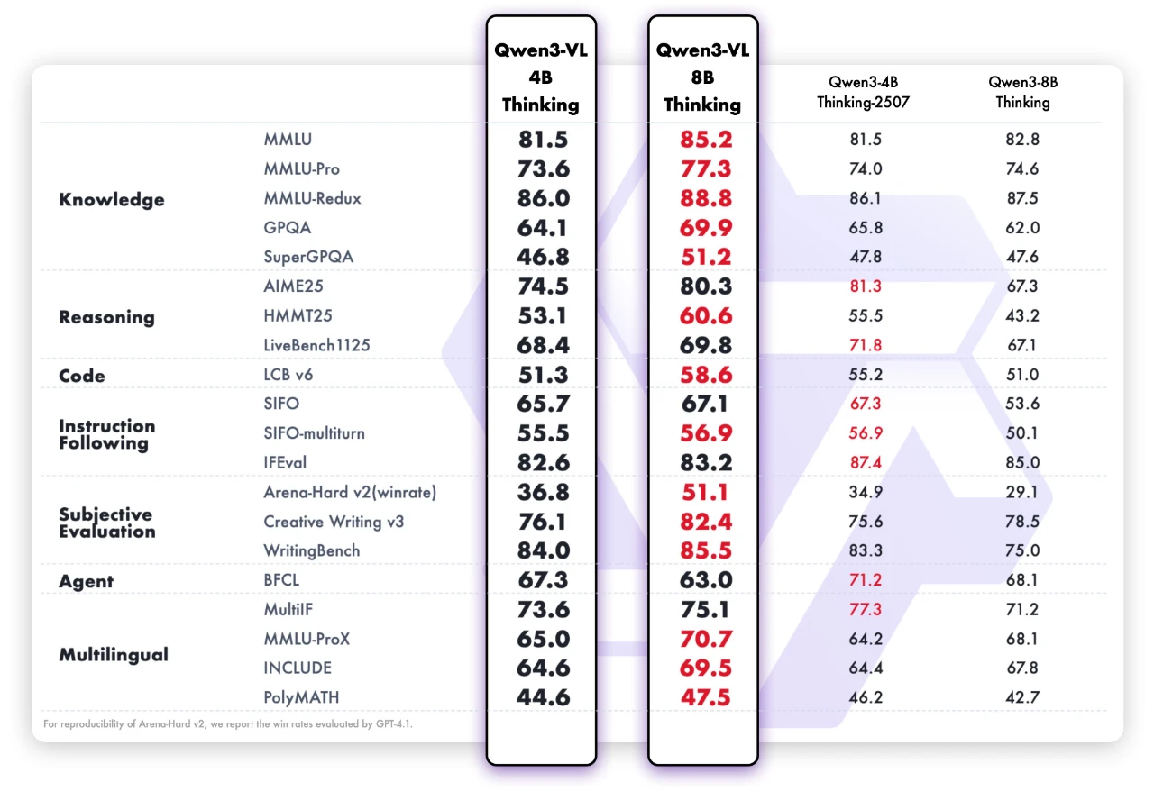 本次发布包含了 4B 和 8B 两种参数规模,两个尺寸均提供 Instruct 与 Thinking 版本。我们实现了以下关键目标:🔹 更低的资源门槛:尺寸缩减显著降低 VRAM 的占用。现在,开发者可以在更广泛的硬件设备上部署和运行我们的模型。