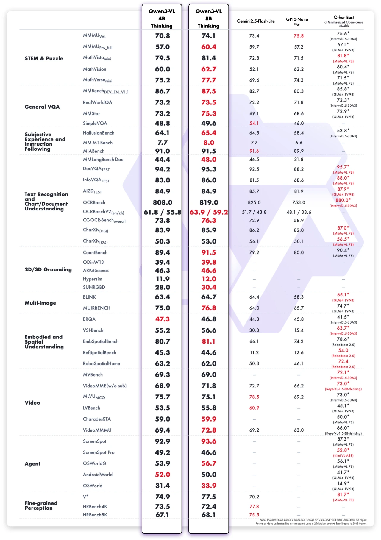 🔹 卓越的基准性能: 在 STEM、VQA、OCR、视频理解及 Agent 任务等多个权威基准上,其表现不仅超越了 Gemini 2.5 Flash Lite 和 GPT-5 Nano,在许多场景下甚至能与我们半年前的旗舰模型 Qwen2.5-VL-72B 相媲美。