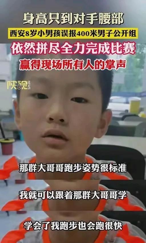 他强任他强,清风拂山岗!西安8岁小男孩梅亦梵不但勇敢挑战成人组U18的400米比赛,还顺利完赛并取得1分26秒的成绩,真是令人刮目相看! 同时他也成功引起了中国短跑名将苏炳添的关注,苏炳添在得知消息后暖心鼓励梅亦梵小朋友:心理素质不错,期待你第一个冲过终点的那天! 稚气未脱的小男孩因为妈妈的一次误报,成就了这一乌龙事件。但是“小孩哥”在比赛中并没有放弃,他和比自己高出近一倍的哥哥们同场竞技,可谓勇气可嘉,也展现出了永不放弃的精神,这种不怕困难、勇往直前的体育精神值得每一位运动员学习!加油! #运动每日打卡# #苏炳添鼓励误报400米比赛小孩哥#