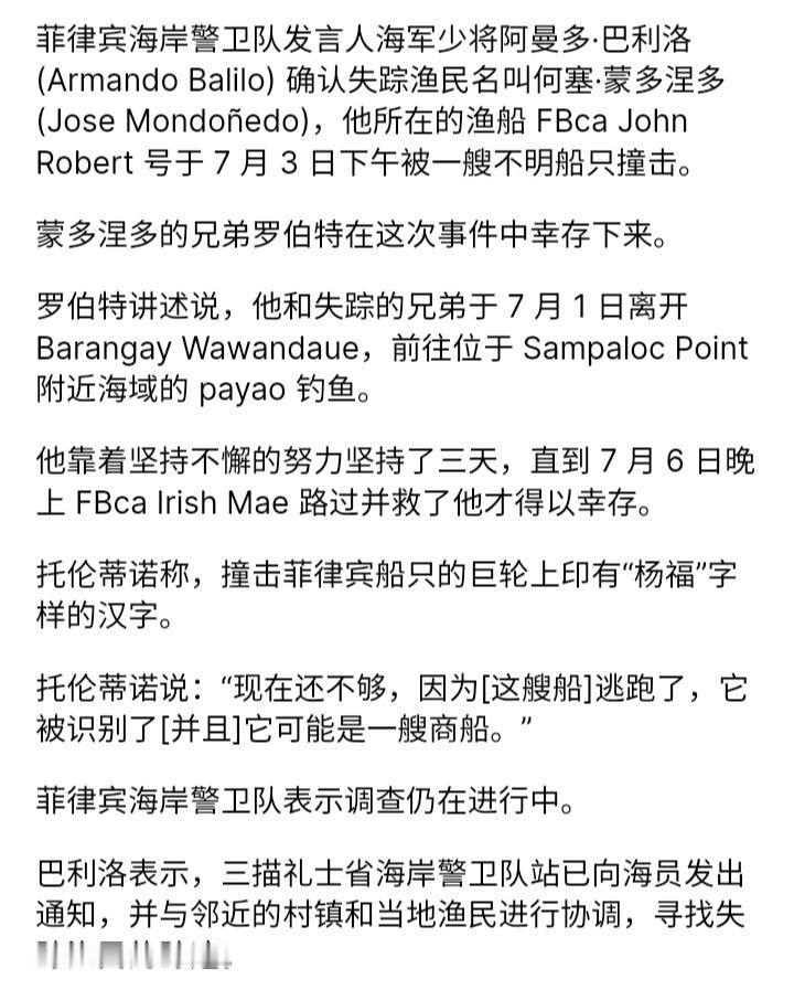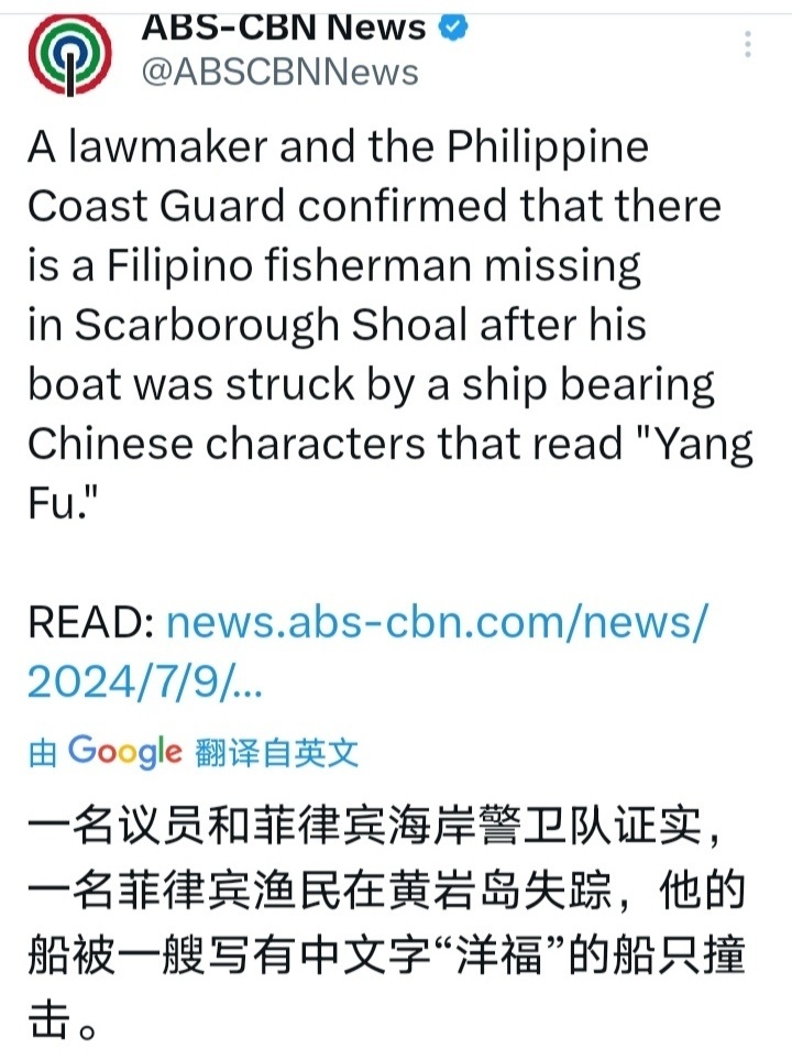 #烽火问鼎计划#据菲律宾媒体报道,菲海警称一名菲律宾渔民在黄岩岛失踪,他的船被一艘写有中文字"洋福"的船只撞击。