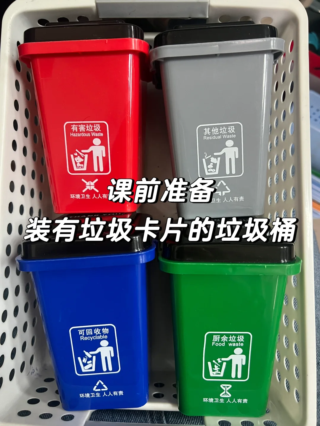 4个垃圾桶为一组(可回收、其它、有害、厨余),里面装有各种各样的物品卡片