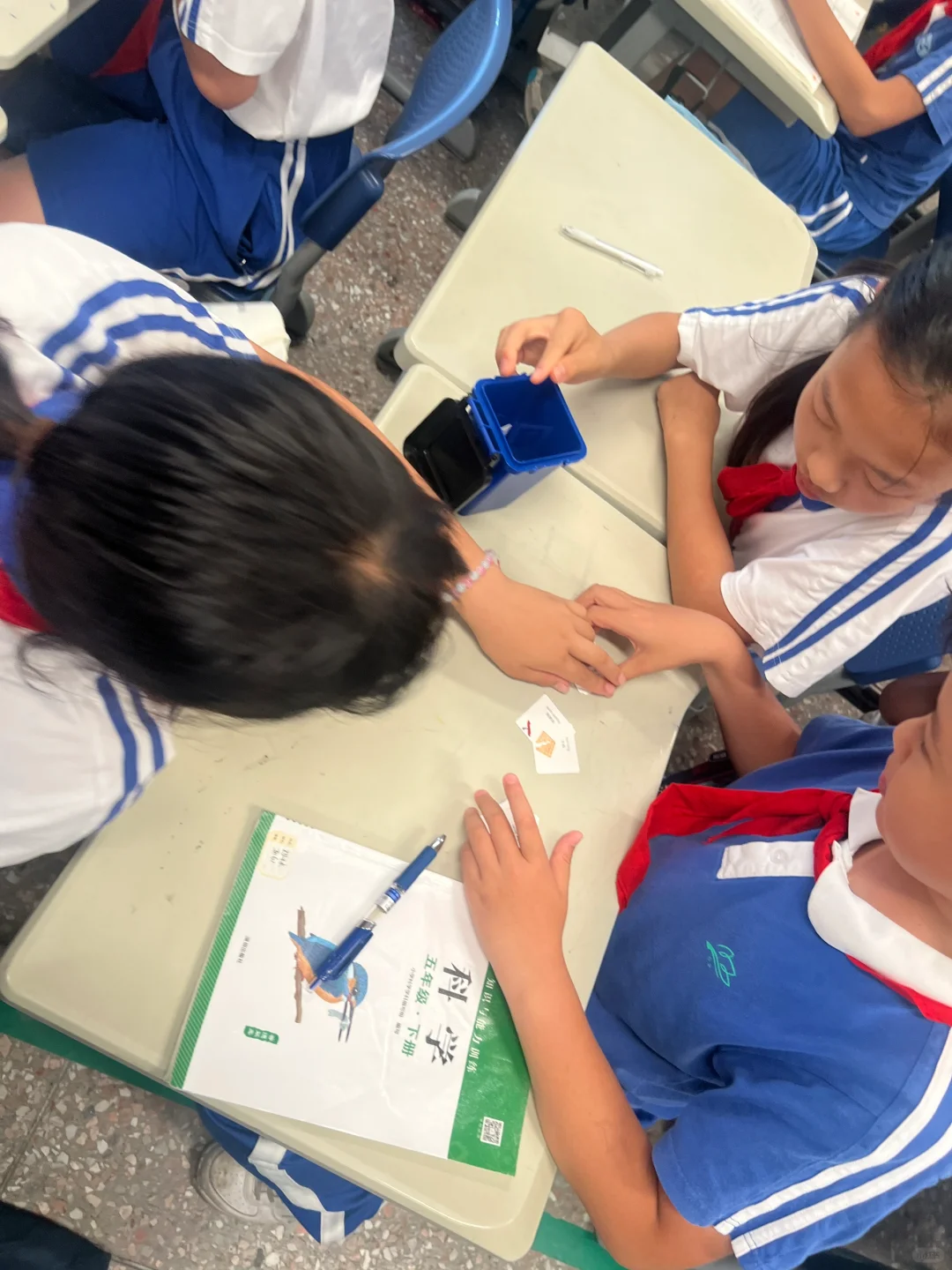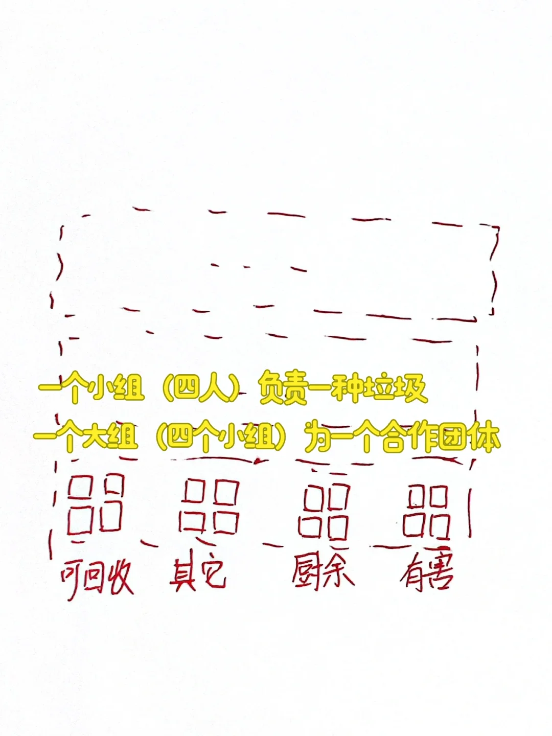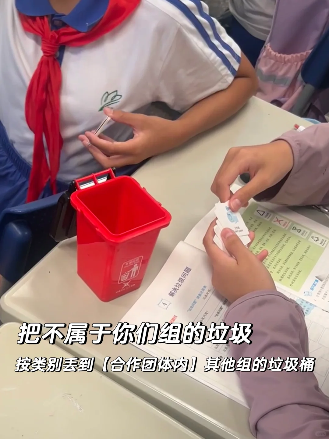 🔵每个小组负责一种垃圾,四个小组为一个“合作团体”。挑出不属于自己垃圾桶的垃圾,并把它们分开后【扔入同一合作团体内的垃圾桶】