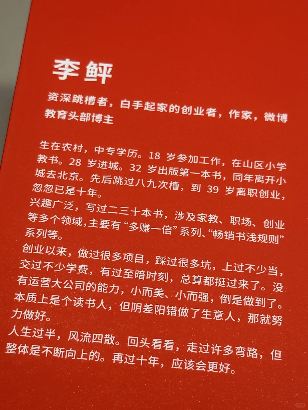 作者李鲆,资深跳槽者,白手起家的创业者,作家,头部教育博主。让人意想不到的是,在这些光鲜亮丽的名片背后,是一个出身农村、仅有中专学历、18岁就独自出外谋生、没有任何资源和背景的草根,把一手烂牌打出王炸的励志故事‼️