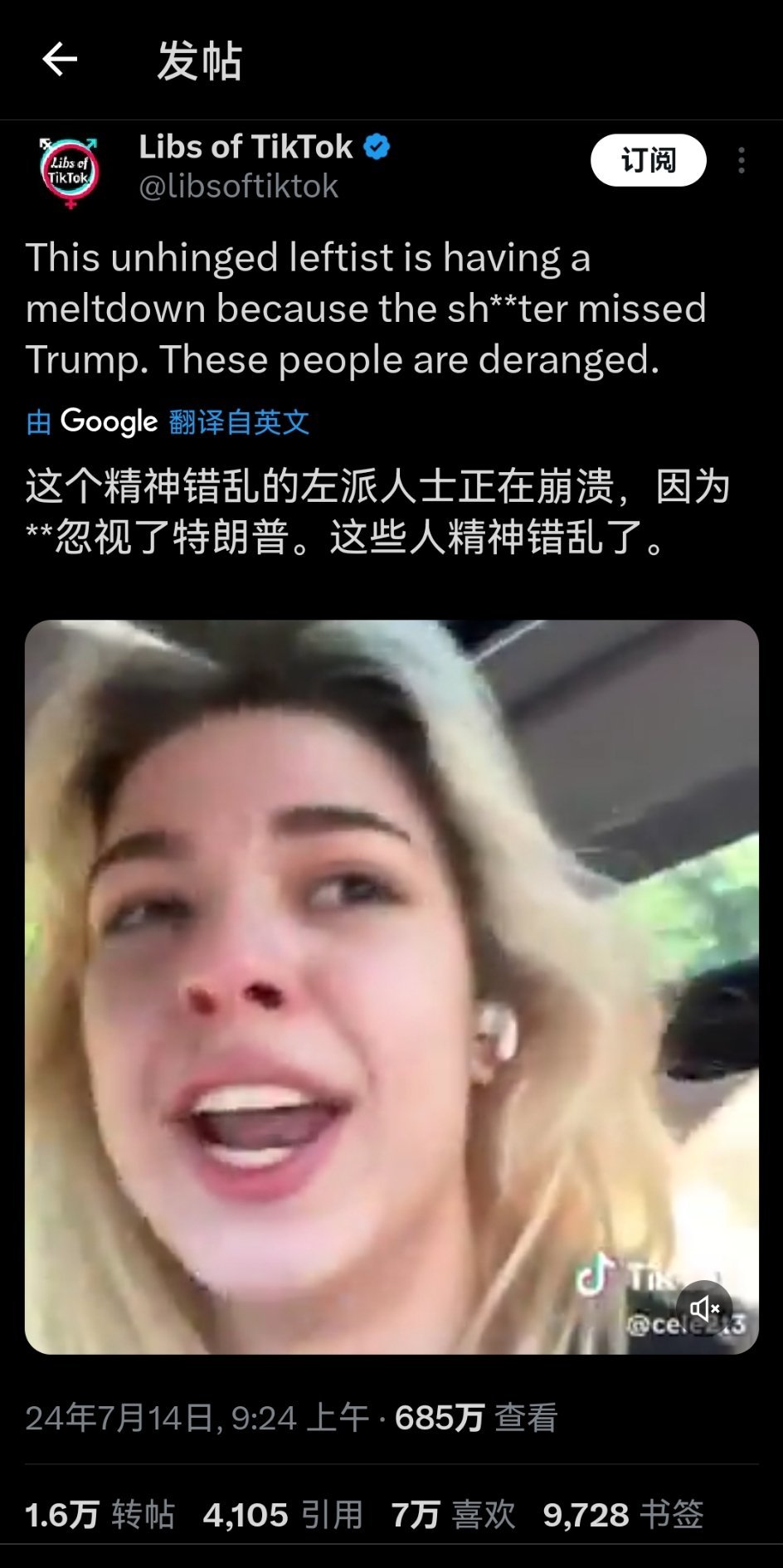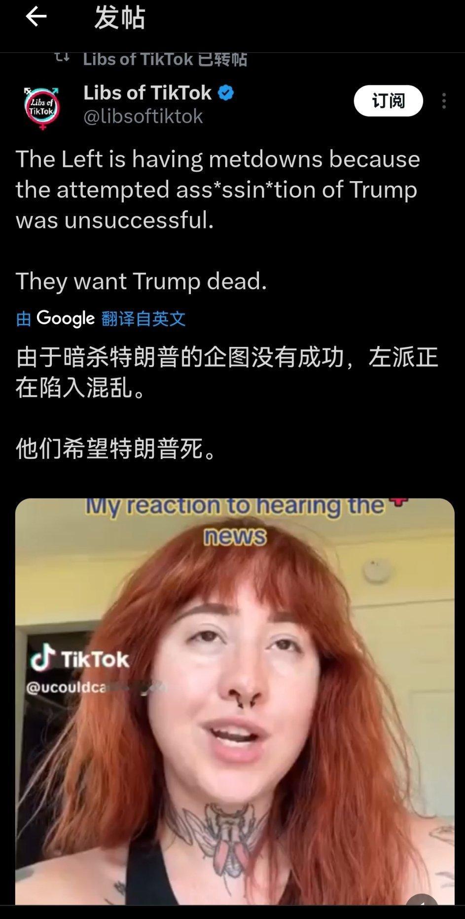 美国左翼因为特朗普没死感到愤怒和不满,有左翼威胁再次刺杀特朗普,被右翼账号艾特F