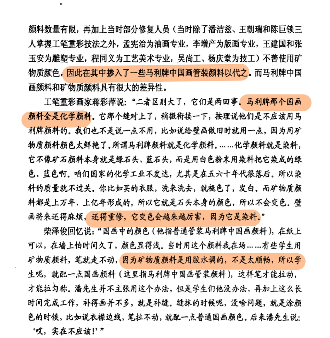 补绘时由于矿物质颜料有限,有些画家在补绘时用了一些“马利牌中国画管装颜料”,这部分以后颜色会变浅。