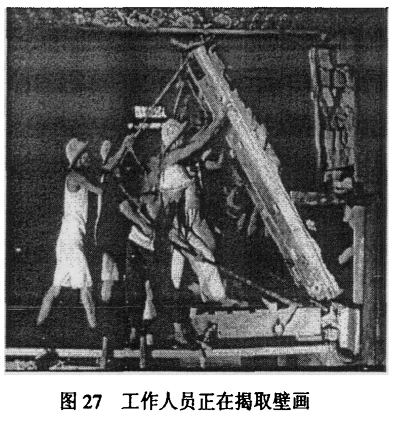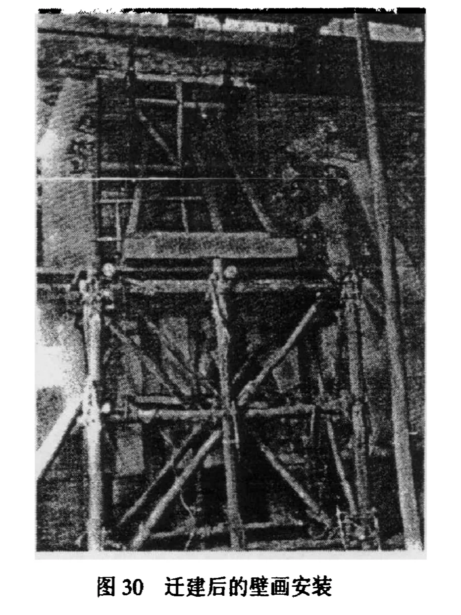异地复原时,原来墙体的位置用木支架代替,一块块的壁画是被“挂”在木架上的。