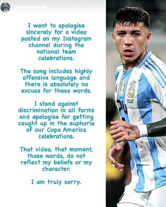 恩佐深陷直播间种族歧视丑闻!阿根廷夺得美洲杯冠军后,得意忘形的阿根廷球员们在车上唱了一首关于种族歧视的歌曲:“他们为法国踢球,但他们来自安哥拉!” 而此时恩佐正在直播,此段视频随即引起轩然大波,只因恩佐效力的切尔西一线队内,目前就有7名法国球员,这举动无疑是触动了他们的神经,随后共有10名切尔西球员纷纷取关恩佐,看来恩佐的切尔西之旅凶多吉少! 恩佐马上发表道歉予以回应:“我反对歧视,那些并不反映我的信仰。”切尔西随即官宣:“任何形式的种族歧视行为都是不可接受的,我们理解并感谢恩佐的道歉。 作为俱乐部,我们会对他发起纪律调查。” #10名切尔西球员已取关恩佐#