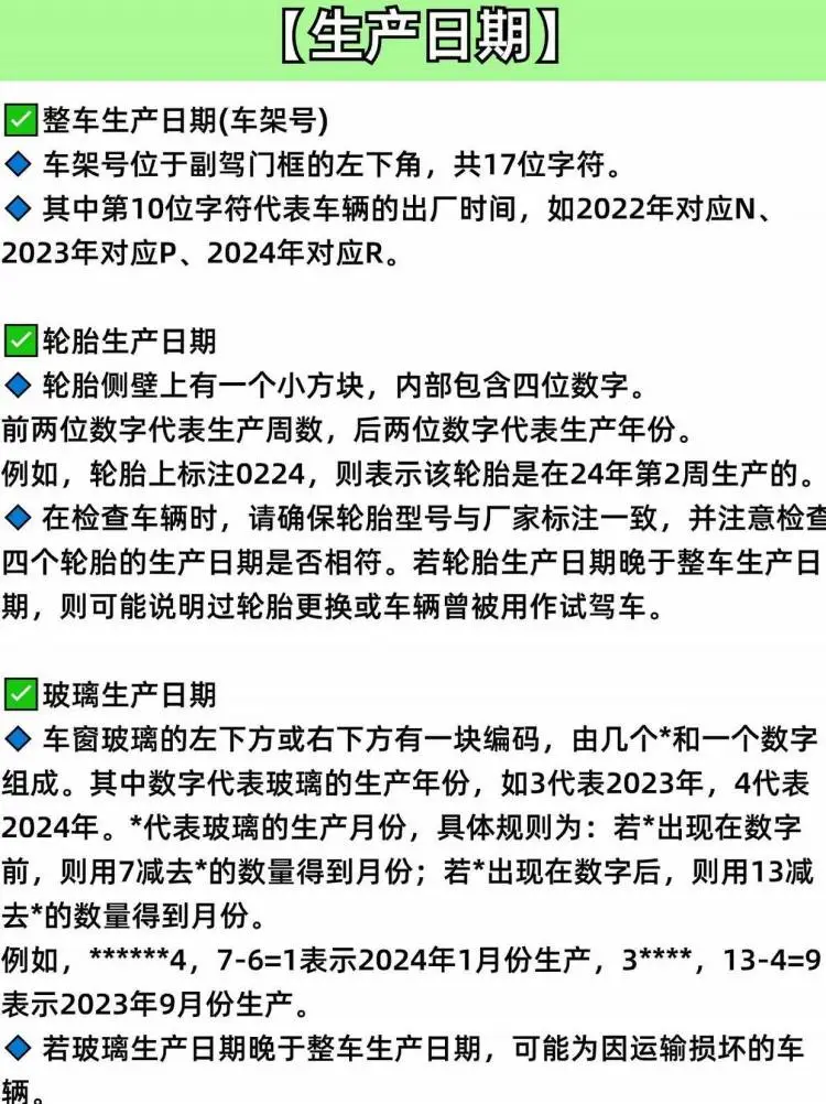 👉 整车生产日期和轮胎、玻璃的生产日期是车辆质量的重要指标。车辆的生产日期可以通过车架号、轮胎侧壁的编码以及玻璃上的标识进行确认。📊