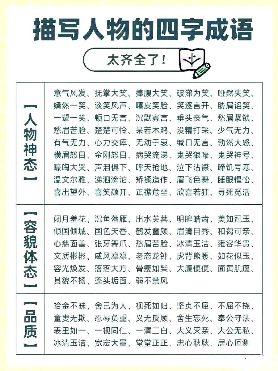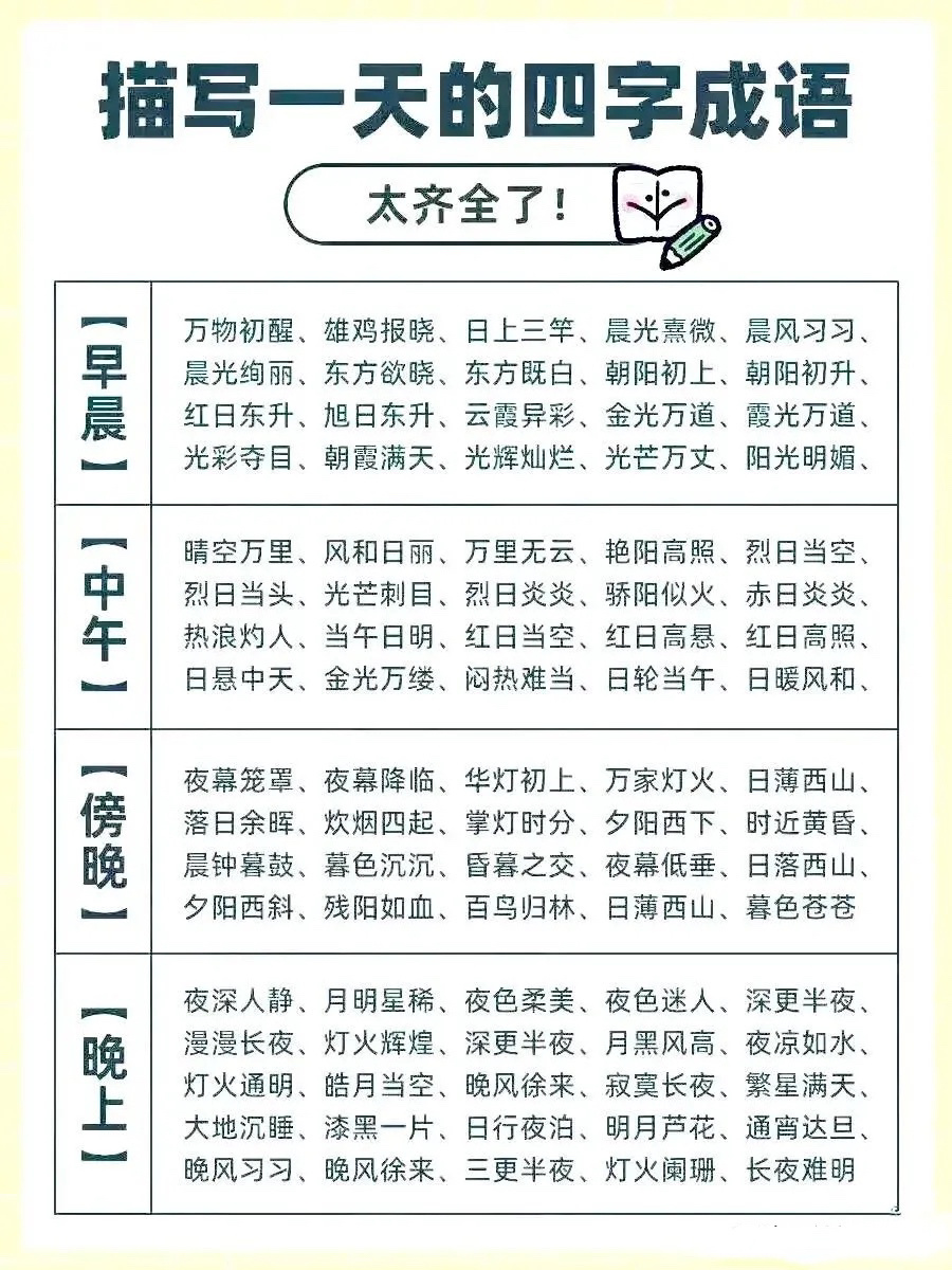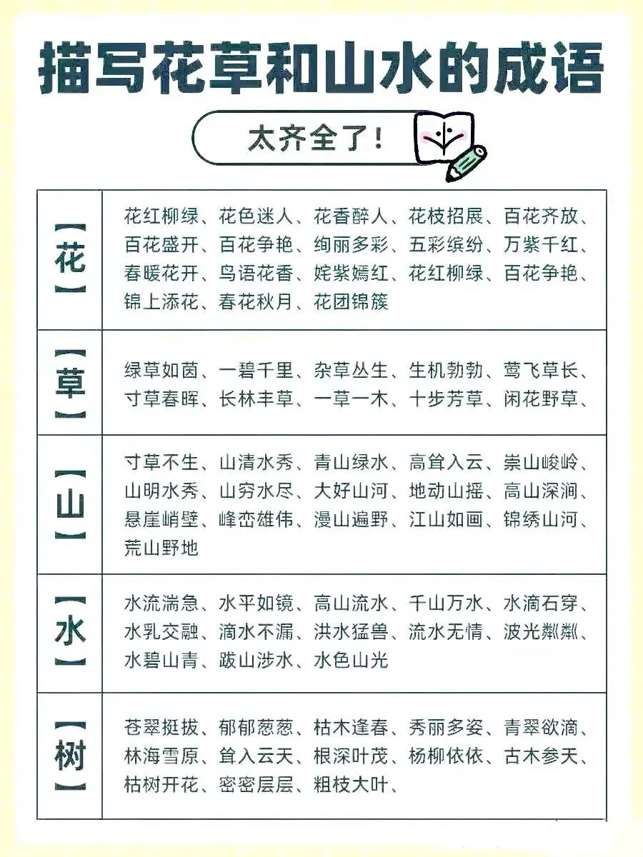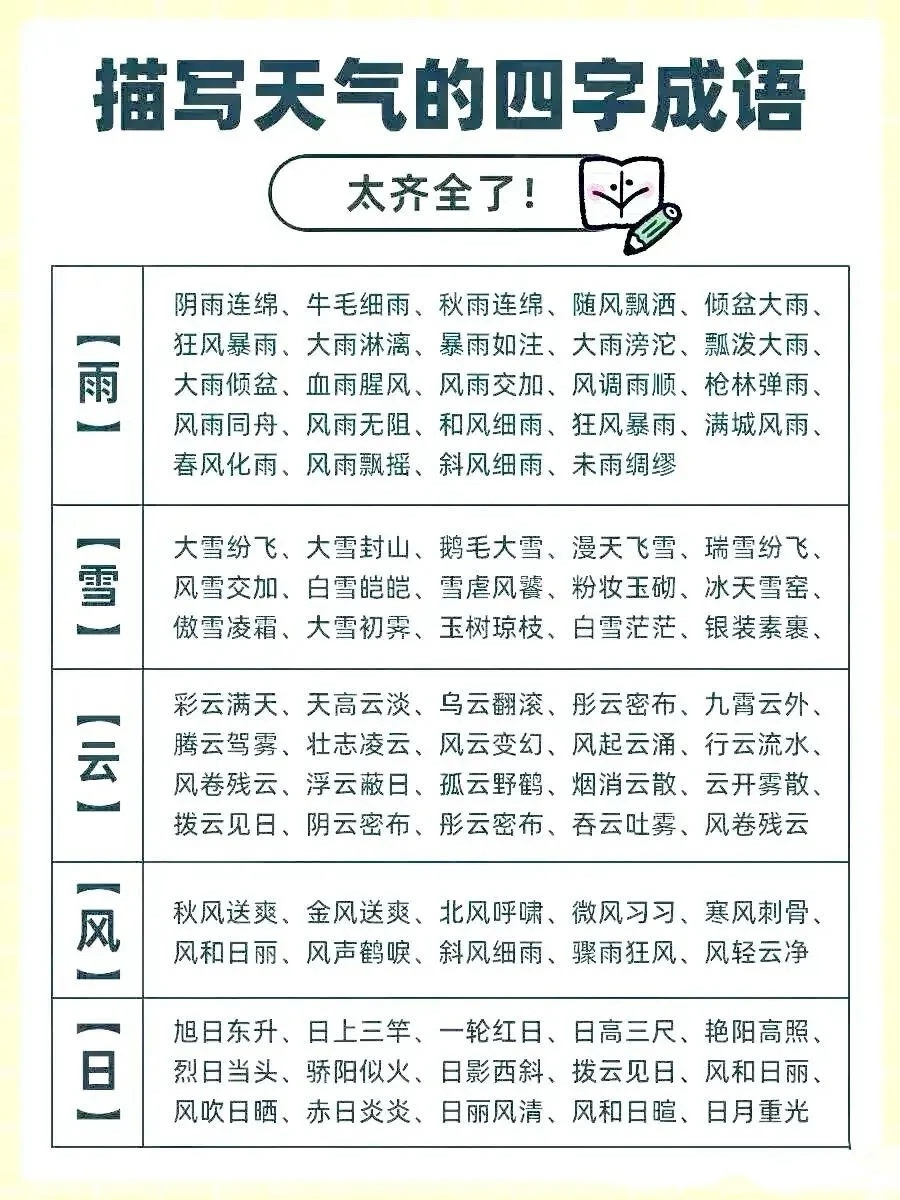 暑假没事就让孩子把这些成语倒背如流,然后写进作文里,言简意赅,文采飞扬,描写“天气、一天、花草、山水、人物”的成语,全都分类整理在下图了,快给孩子收藏起来吧,一定用得上!