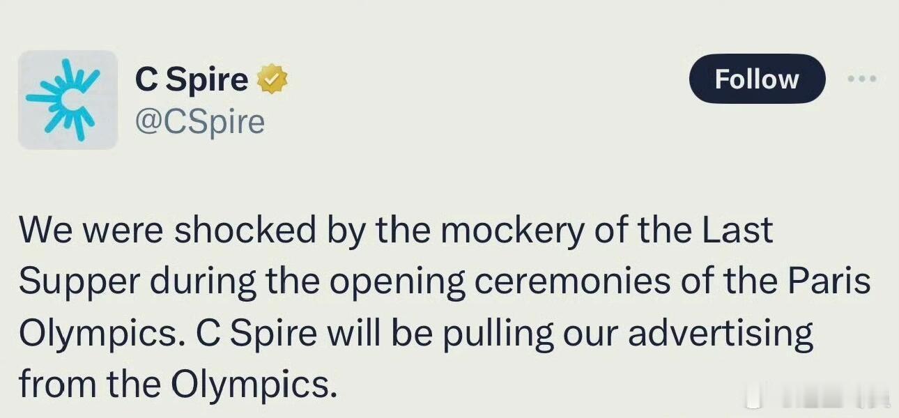 祸不单行,此次奥运会的赞助商之一,美国科技公司C Spire因为对开幕式内容不满,宣布将撤出自己在奥运会期间的所有广告。