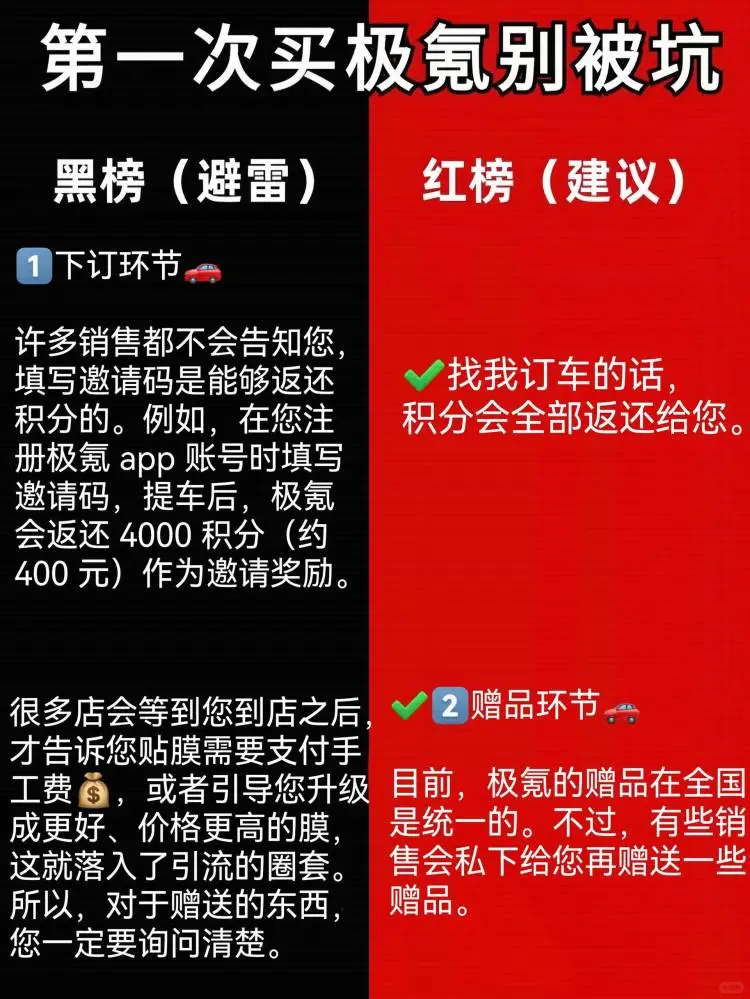 目前,极氪的赠品在全国是统一的。不过,有些销售会私下赠送额外赠品⚠️。例如,赠送太阳膜、车衣等。注意,很多店会在您到店后才告知贴膜需要支付手工费💰,或者引导您升级成更贵的膜,这可能是引流的套路。对于赠送的东西,一定要询问清楚。