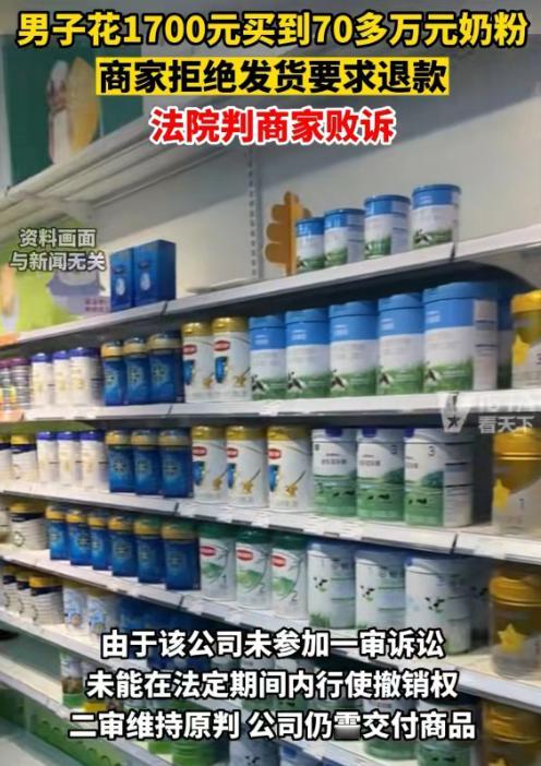 [送心]广西柳州,小伙网购时意外发现3罐驼奶粉只要2元,于是赶紧下单850件,共2550罐,共计费用70多万,却仅支付了1700元。不料,商家虚假发货,小伙投诉,却被告知订单异常,要求小伙申请退款。小伙不服,状告法庭,要求商家如约交付2550罐驼奶粉。法院的判决亮了。 (信息来源:青豆新闻——《5月10日,据媒体报道,广西柳州,男子花1700元买到70多万元奶粉.....》2023-5-13) 赵先生原本以为,养个孩子要不了多少钱,直到他亲自去购买孩子的必需品后,才发现原来养个孩子真的不容易,接触皮肤的布料有要求,尿布也要选性价比高的,更别提一日就要喝几次的奶粉,一罐下来就是好几百,且消耗速度也很快。 这天,孩子的奶粉即将喝完,他照例到网上选购奶粉,此时一个做促销活动的页面吸引了他,尤其是那个价格,三罐仅需两块钱,这四舍五入就等于不要钱。 因为该品牌还较为有名,赵先生也不担心是虚假、三无产品,这价格简直香的他乐呵呵,也防止活动时间有限,就干脆一次性将数量加购到八百五十件,等于是两千五百多罐奶粉。 一看费用共计,也就才一千七左右,用平时一罐三百多的价格换算下来,这批奶粉就要将近七十万多万的价格,这羊毛薅的赵先生心里乐开了花,以后再也不用愁孩子的奶粉了,能为家里省了一大笔钱呢。 但这巨大的落差还是让赵先生有点担心,害怕商家要么他退款要么就不发货,如果真的这样,那或许就是商家弄错价格了,不过赵先生心想,出这么大的纰漏,就算拒绝他,自己也能得到一点补偿,反正怎么都不会亏。 可他没想到,很快就在平台页面看到了商家已发货的通知,这样的结局是赵先生意想不到的,毕竟两千多罐奶粉啊,才一千多块钱,商家做慈善呢?但既然已经发货了,那他只需要等待奶粉的到货即可。 考虑到货物较多,物流应该会比较慢,赵先生也就没去盯着,反正应该也不会超过一周左右,就这样几天后等他再次打开平台页面时,想看看物流到哪了,不料上面显示的是已签收。 赵先生都懵了,他啥也没拿到,消息也没收到,怎么就已签收了呢?他直接去问客服怎么回事,对方告知了他因为标价错误,不会照常给他发货,建议申请退款,他们会全额返还。 如此轻飘飘的回应,就想当没这回事?赵先生不服气,找平台投诉,要求商家补发,但平台却以谋取利益,违规操作为由,驳回了他的申请。 浪费了他这么长时间,最后就想随便打发他,赵先生咽不下这口气,直接将商家告上法庭,要求他们履行义务,给自己补发相应的奶粉。 这件事的发生,源于商家标注错误导致,赵先生在平台购买商品,订单也成功提交,意味着双方的买卖合同已生效,如果不想承担,早在一开始跟赵先生说明即可,双方协商沟通。 但又因为虚假发货,试图逃避责任,这样的行为属于违背诚信,因此,最终法院判定,商家需按照订单履行供货义务,对此结果,商家不服提出上诉,但二审驳回,维持原判。 (文中姓名皆为化名)
