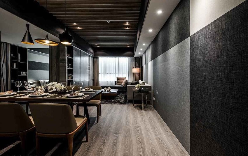 客厅的沙发背景墙用的是仿纺织布的墙纸作为装饰,黑白灰的相间搭配起来很好看。