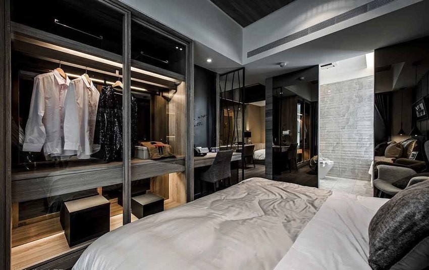床尾正对着的空间做了内嵌衣柜装饰,玻璃门的隔断,这样的设计非常好的一点就是可以一眼就看到自己想要穿的衣服了,而且内部设计了隐藏灯,非常的漂亮,高级感就这样出来了。